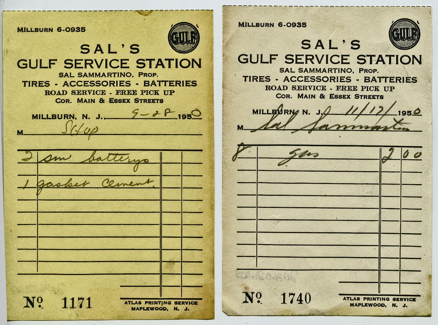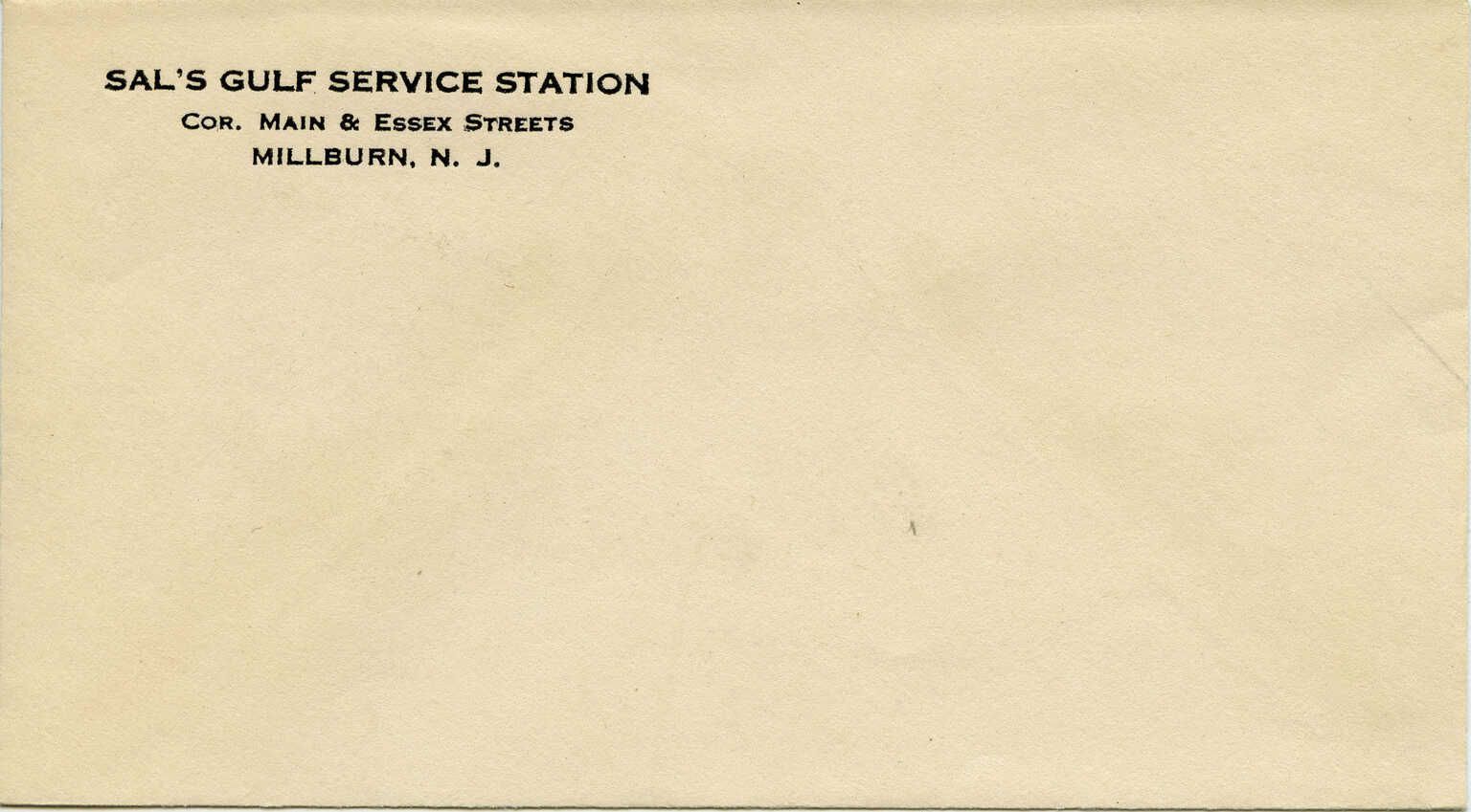 Two 1950 receipts from Sal's Gulf Service Station at the corner of Main and Essex Streets. Salvatore Sammartino, owner/operator of the gas/service station was related to the two Sammartino sisters from whose home on Orchard Street these receipts came. The yellow receipt appears to be undamaged and the white receipt has only faint browning on the left edge on the front of the receipt and a couple of very faint tan spots, one on the name at the top and one on the "No. 1740" at the bottom left. The enveloope is postally unused and empty.Acquisition