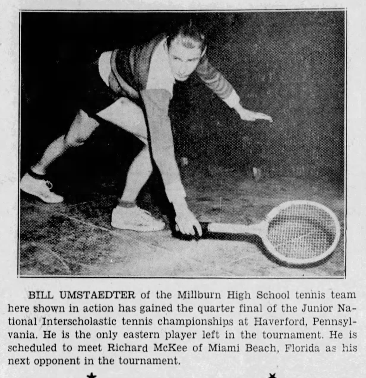 Umstaedter at National Junior Tennis Championship. Caption: Former Boy Champ After New Laurels: Bill Umstedter (sic) of Millburn, NJ, former holder of the boys indoor tennis title, is shown in action in the National Junior Championship, first round, against Jay Berk, of the University of North Carolina today at the 7th Regiment Armory here. Bill won his game after losing the first set. Score: 3-6, 6-2, 8-6.