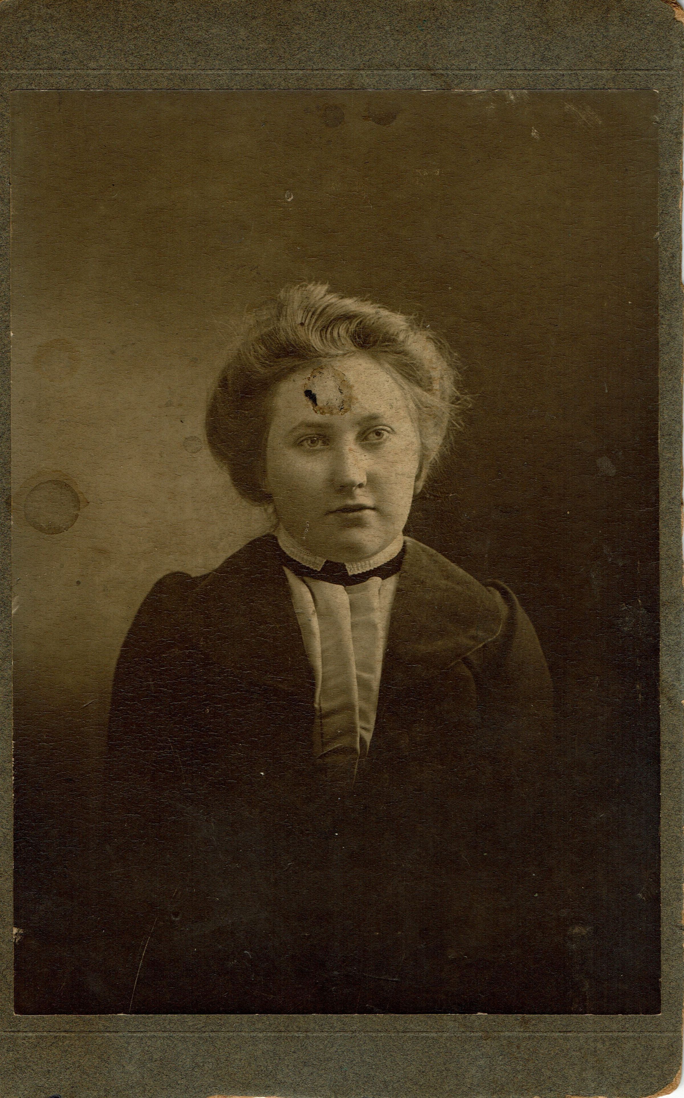Photograph of unidentified woman wearing a tailored black jacket. Possibly related to the Trowbridge family. Photograph has several stains and is grimy.Photograph Details