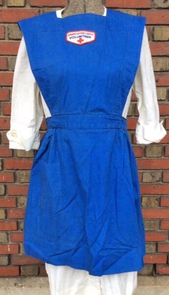 Dark blue pinafore with "American Red Cross; Volunteer" patch at top center of bib. The pinafore ties in the back, at the waist and fastens with a hook and eye at the neck. There is one patch pocket at the front, on the wearer's right hip. The pinafore shows gentle overall fading, probably from laundering.Acquisition