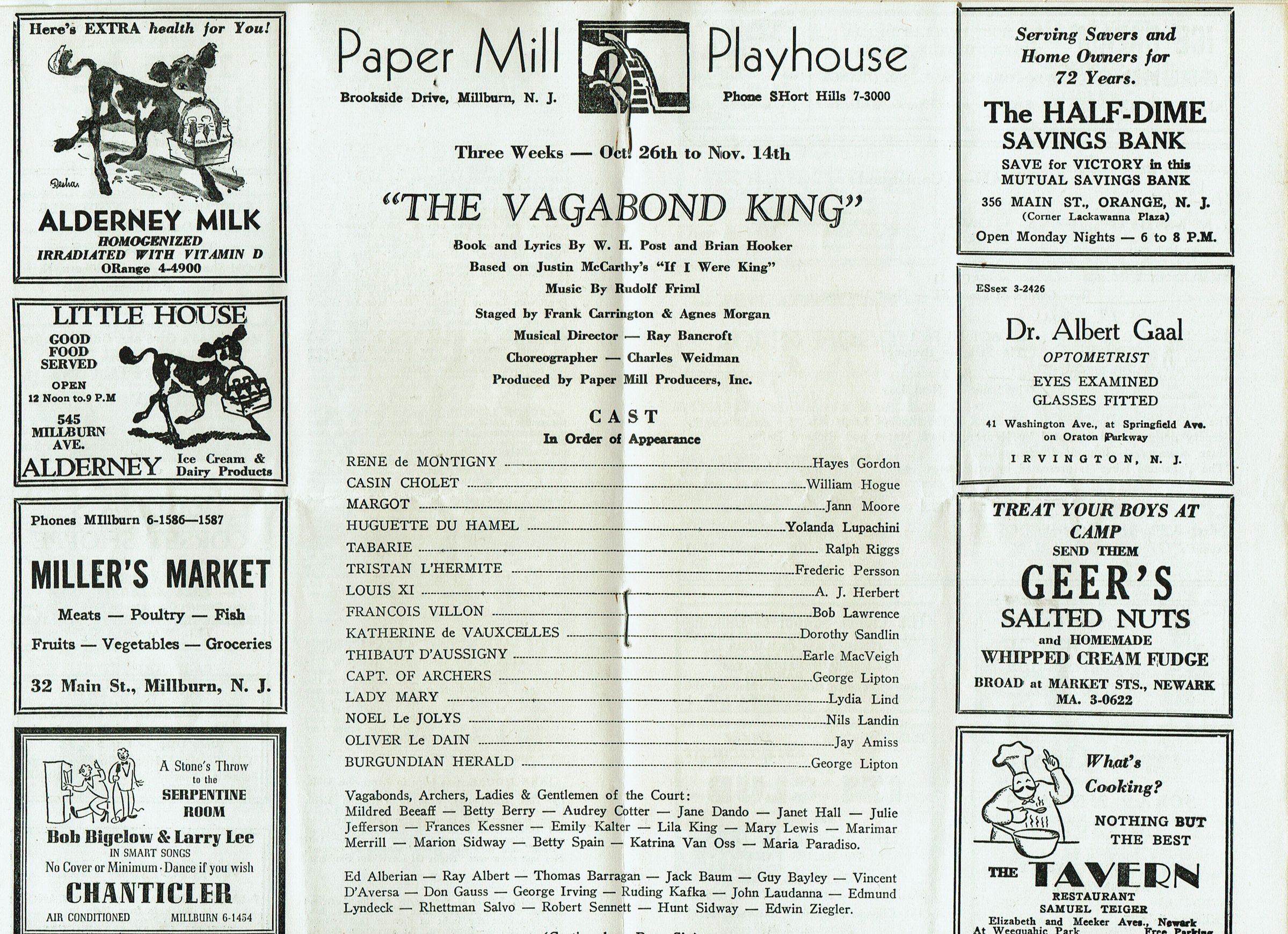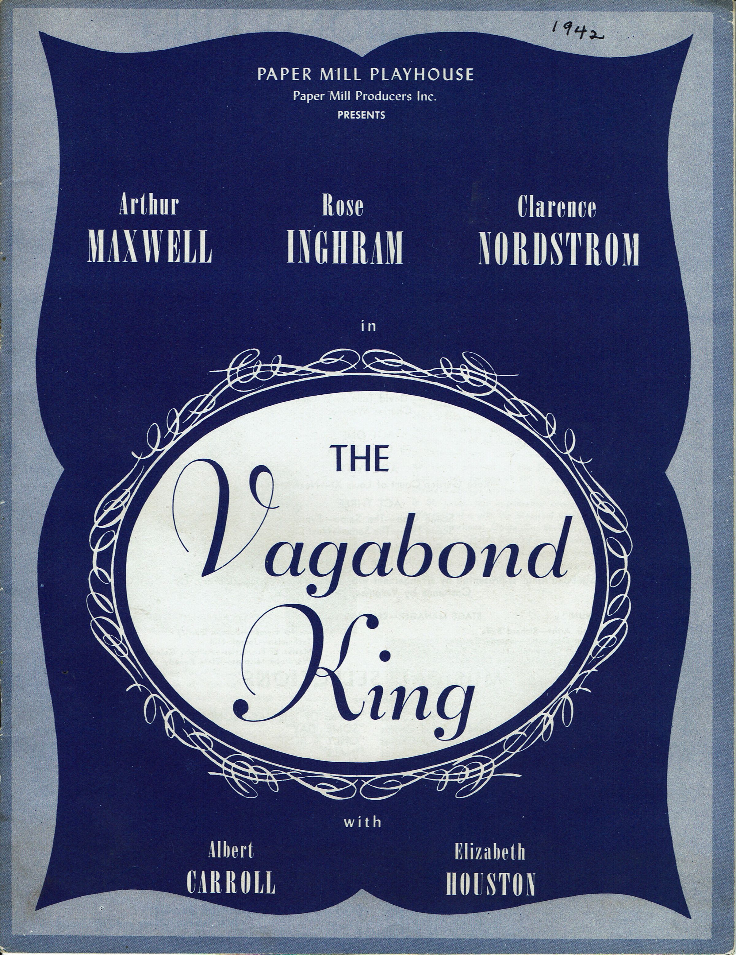 Souvenir Program for 1942 Paper Mill Playhouse Production of "The Vagabond King" with Arthur Maxwell, Rose Ingram, Clarence Nordstrom, Albert Carroll and Elizabeth Houston. Deluxe fully illustrated program with photographs and articles about Paper Mill Playhouse. 20 pp. (Unpaginated). Contains newspaper clipping with review of the production from Newark paper. 8 page program included. Illustrated with advertisements for local businesses.Collection