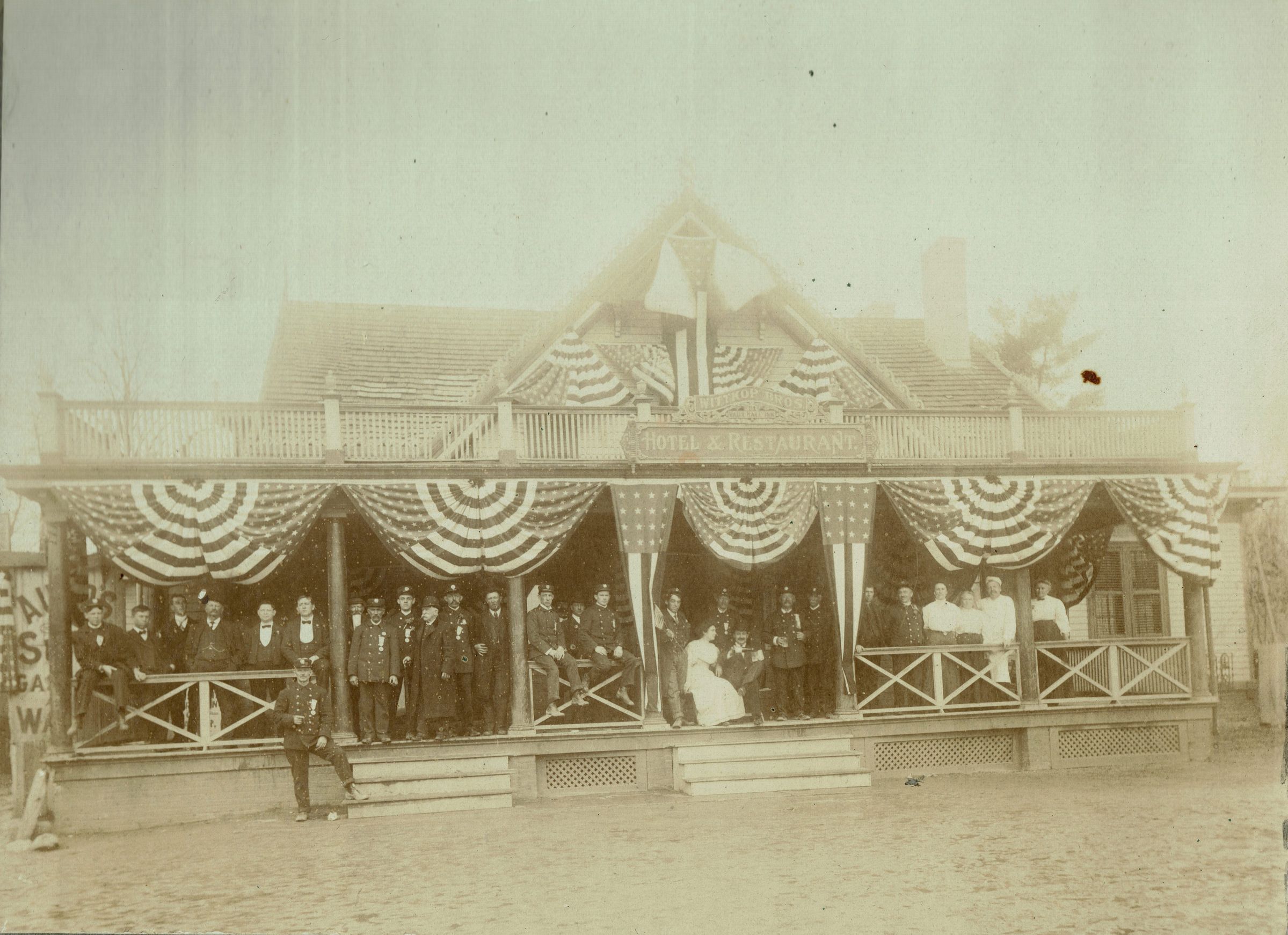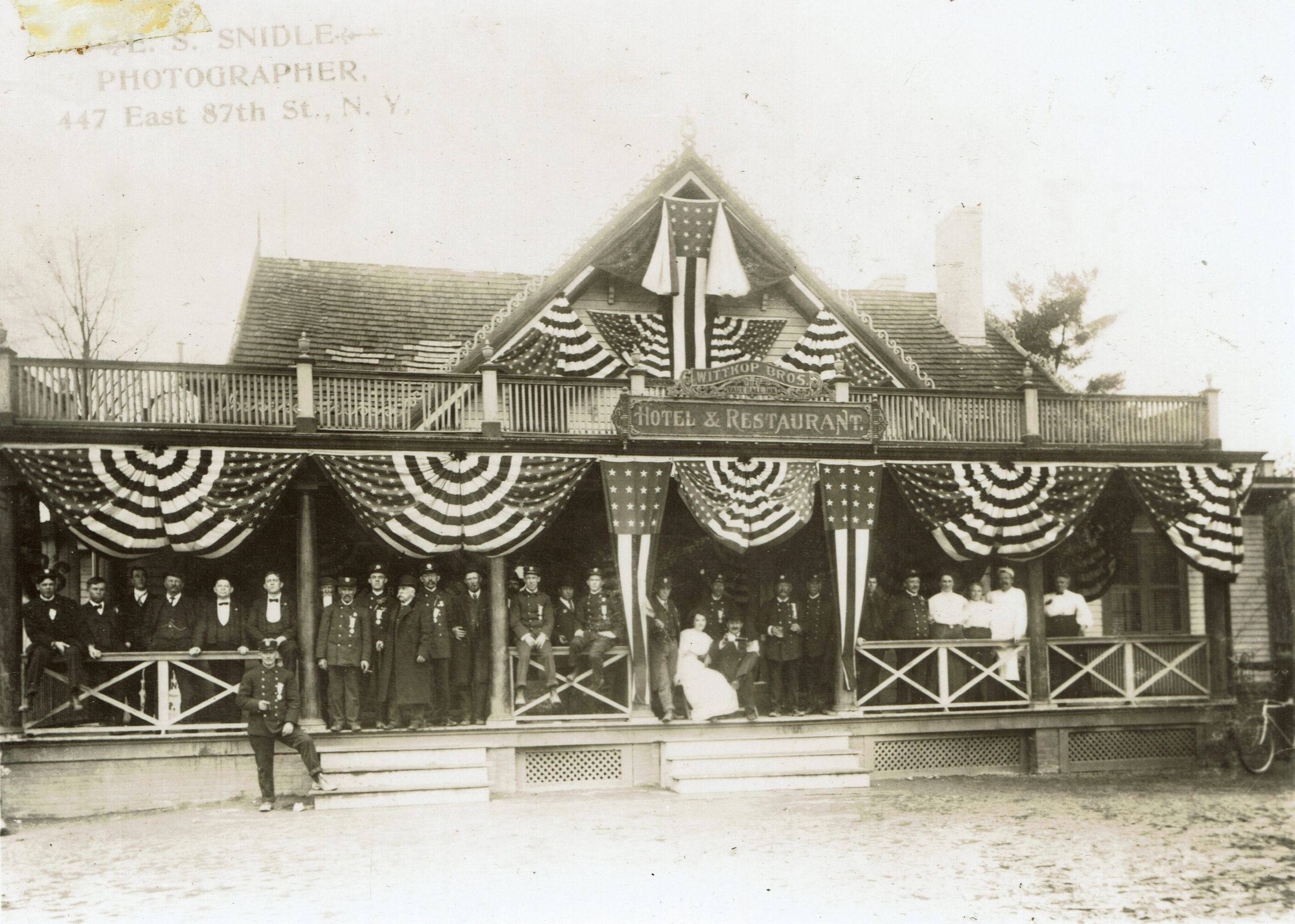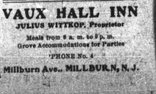 Owned by Julius and Charles Wittkop, the building had been the home of Israel D. Condit before conversion to an Inn, known as the Vaux Hall Inn. In the mid 1930's the building was demolished and a Woolworth's 5 & 10 store occupied the site. Now it is the building in which Goldberg's Famous Deli is located (325 Millburn Avenue). Porch is probably the viewing stand for the parade for local and invited dignitaries.