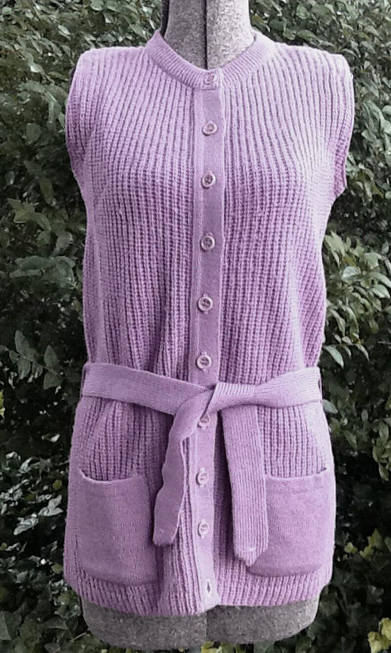 Knit, wool(?), lilac-colored, woman's sweater vest from the Joan Ruth Shop(s), one of the first stores at the new Mall at Short Hills. Store label was crudely hand-sewn into the back neck of the sweater. Some light pilling and light signs of wear. Purchased on eBay from Heather Carlson; 17 Valencia Isle Dr.; Lake Hopatcong, NJ 07849.Acquisition