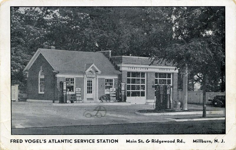 Ca. 1936 postally unused postcard of "Fred Vogel's Atlantic Service Station; Main St. & Ridgewood Rd.,; Millburn, N.J.". There is a 0.5 X 0.25" pencil sketch of small car. Sketch left imprint on back of card. Sketch is in foreground to left of center in front of station door. Corners are bumped. Lower right corner is creased. Light overall soiling. There is vertical crease 1.5" from left on front side. Back says, "100 Percent Atlantic Products; The Most Complete Lubrication Job; In the World...(day or night); Car Washing; Lee Tires & Tubes; Batteries; Simonizing; Cars called for and delivered; Phone Millburn 6-1046; Your Neighborhood Atlantic Dealer; Clean Rest Rooms; Candy - Cigarettes". There are multiple other small creases as well. Published by C.L. Warren & Co. 356 Union Ave, Irvington, N.J. Purchased on eBay on June 21, 2009, for $40.64, from Abigail Frank Collectibles (seller ID 400ireland); Joann Vincent and John Rhody; Fair Haven, NJ?; vj354@aol.com.Acquisition