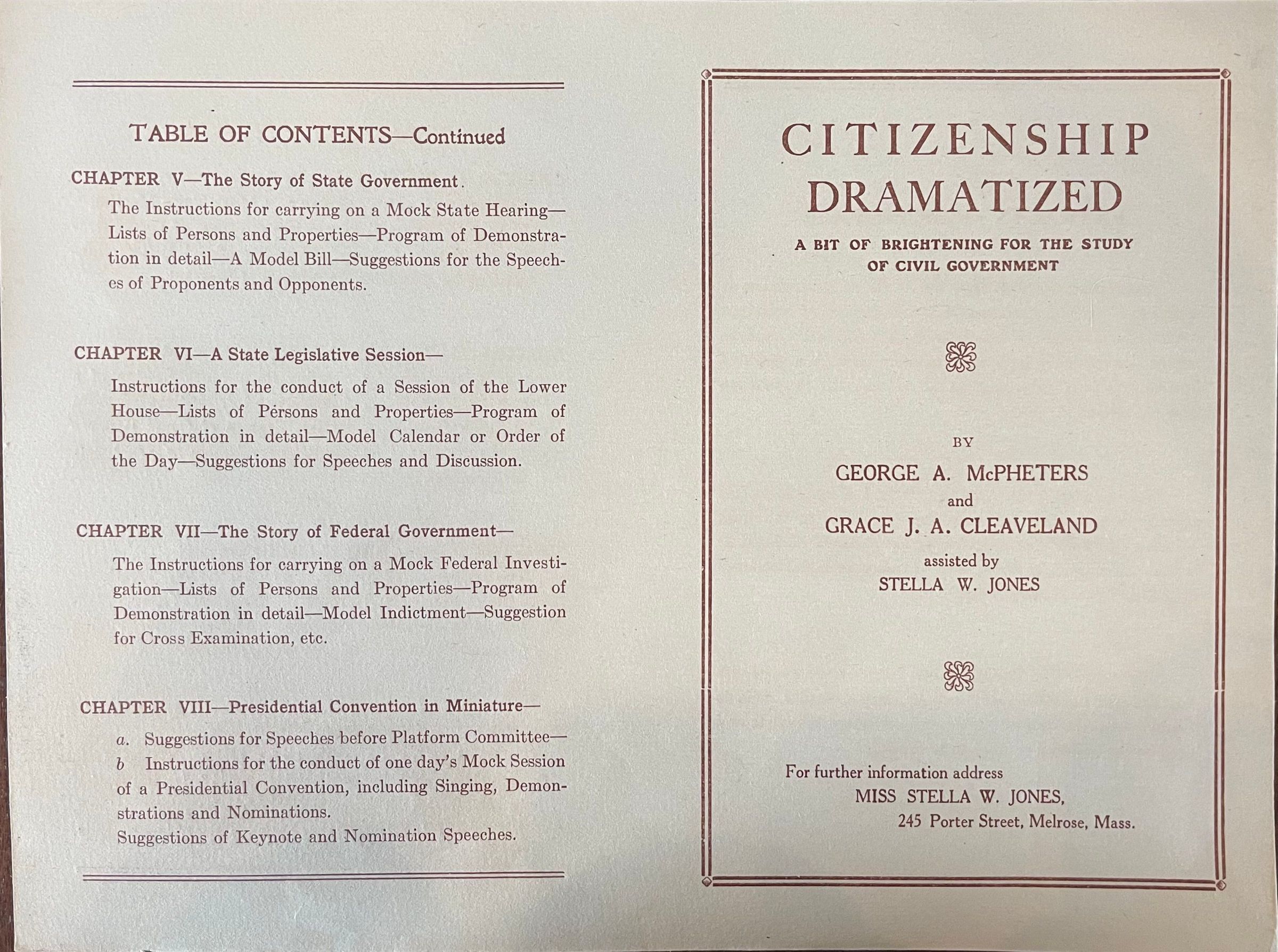 The front cover and table of contents of "Citizenship Dramatized", a pamphlet about the study of civil government directs people who want more information to Stella Voorhees (then Jones). It also notes that she assisted with the creation of this pamphlet. Date unknown.Acquisition