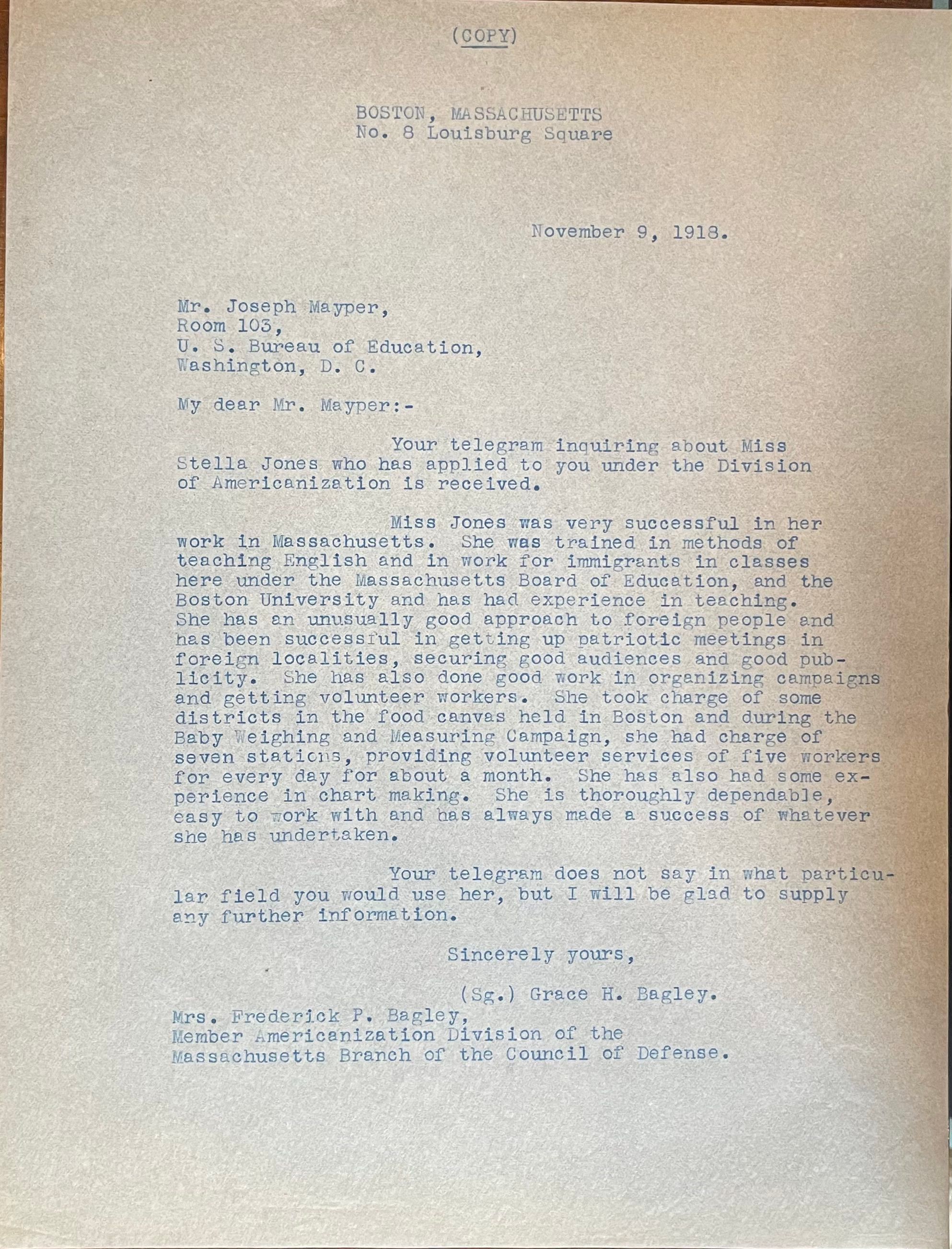 A letter to the US Bureau of Labor talking about their inquiry about Stella Voorhees (then Jones) and her achievements.Acquisition