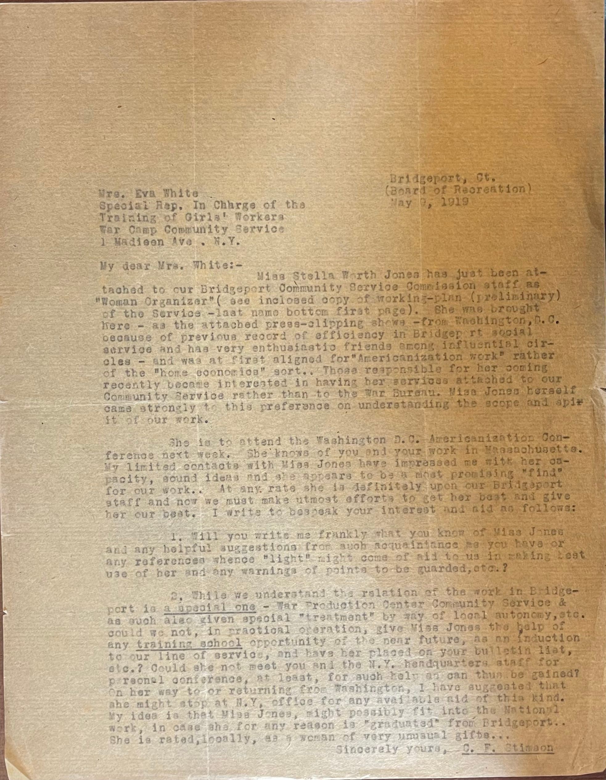 Voorhees: Letter to the War Camp Community Service about Stella Jones (1919)Entry/Object ID