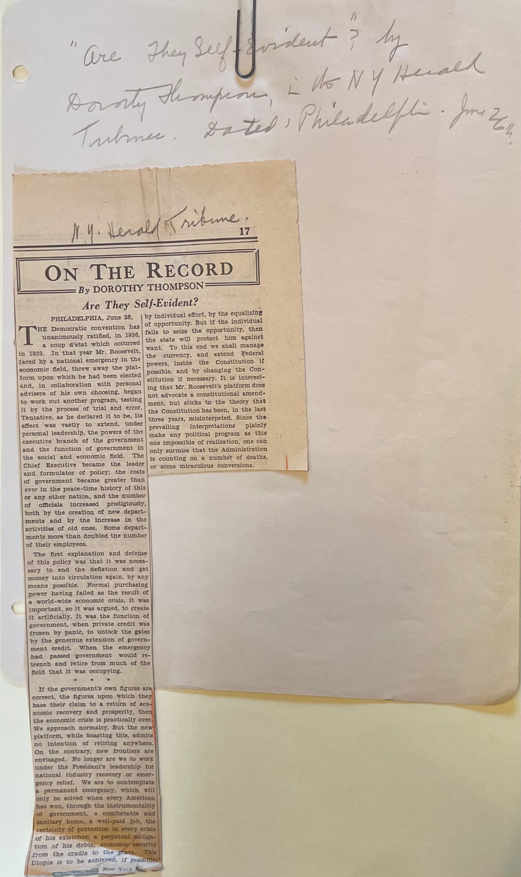 Notes on Dorothy Thompson's article "On the Record" in the N.Y. Herald Tribune about the policies set by the Federal government (June 26, 1936). Her notes consisted of her titling and dating the article.Acquisition