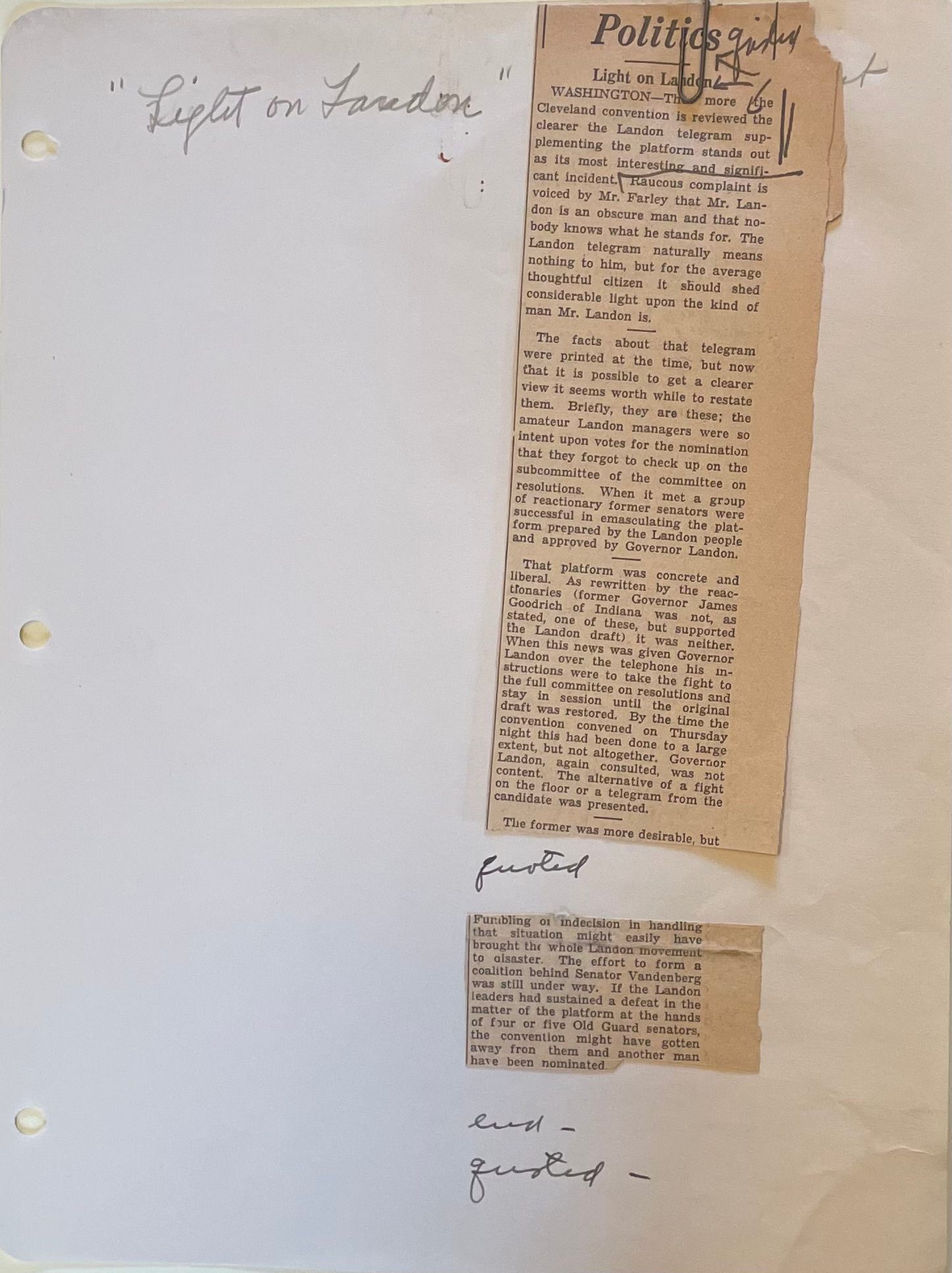 Notes on "Light on Landen" in the politics section of a newspaper (most likely the N.Y. Herald Tribune). She titles and dates the article, includes a cutout of another section of the article, and includes the words "quoted" under these excerpts. Date unknown.Acquisition