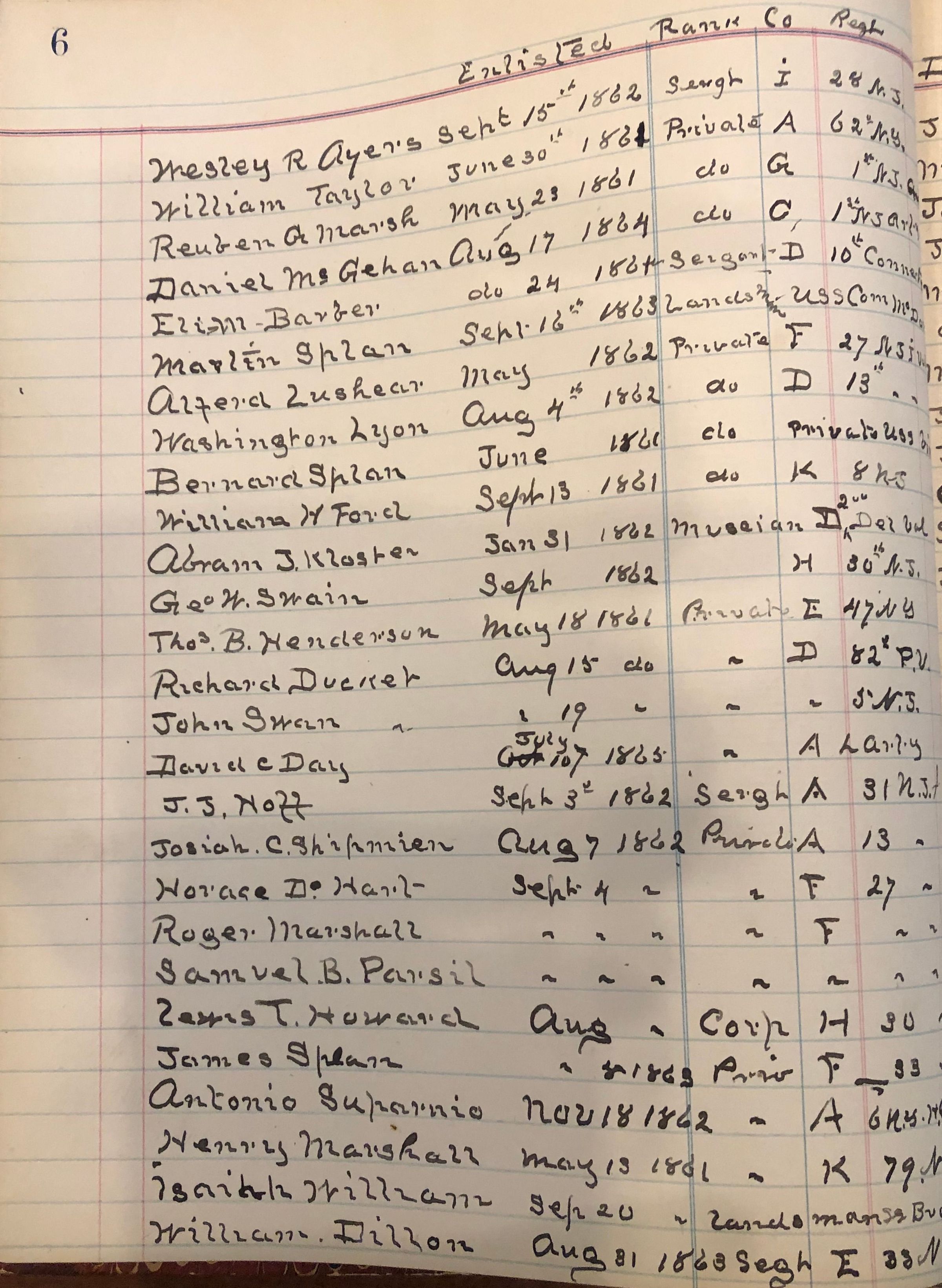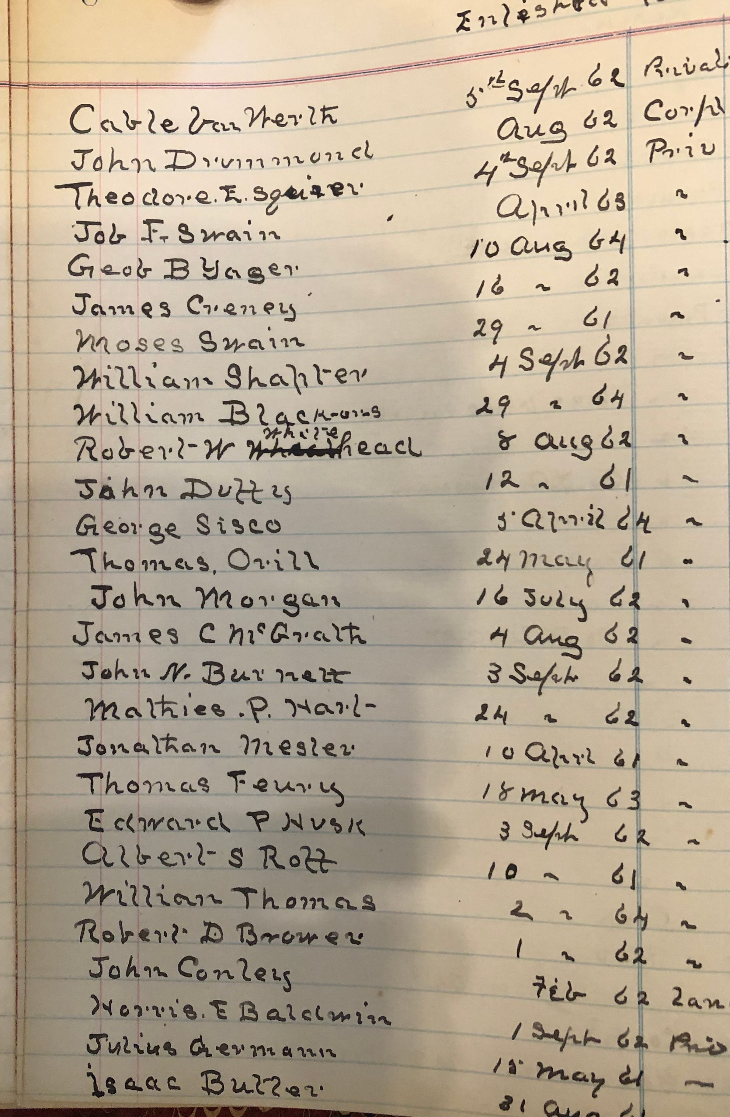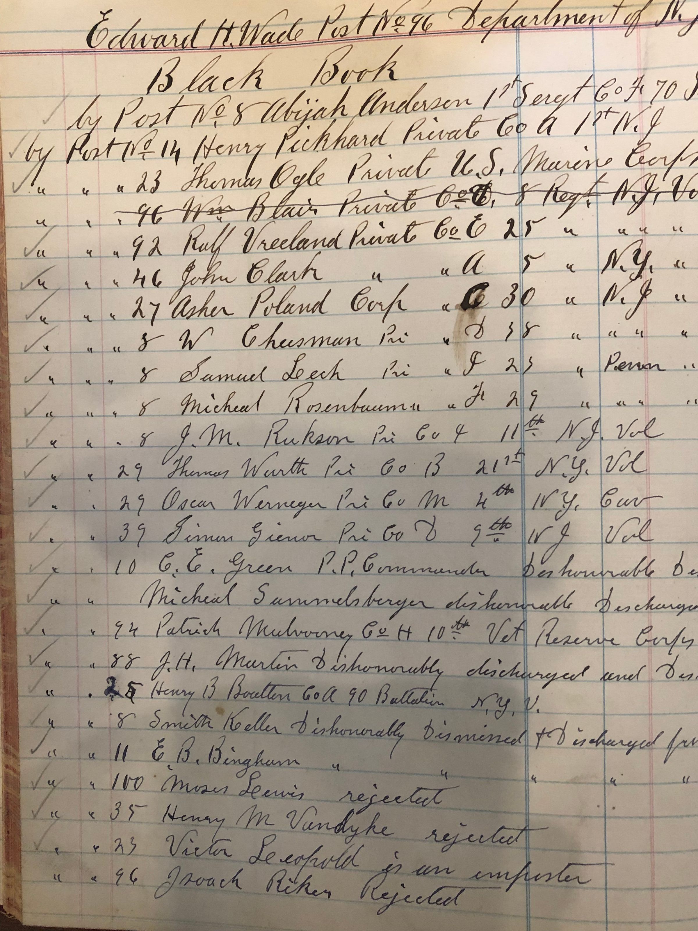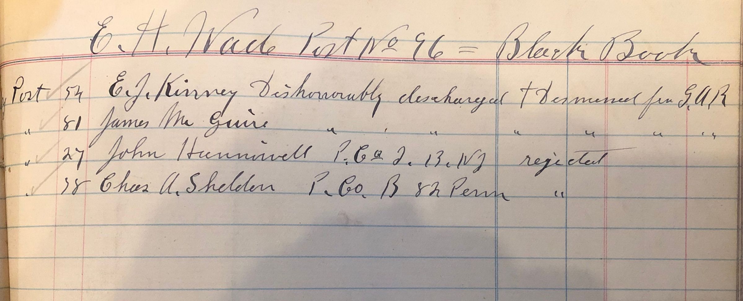 Handwritten notebook detailing membership in the Edward H. Wade Grand Army of the Republic Post 96 and "Black Book" (people dishonorably discharged, imposters, etc). Papers included are names of veterans buried in St. Stephen's cemetery. The Edward H. Wade G.A.R. Post #96 was established in 1885 and named for Captain Edward H. Wade, who died in October 1862 from wounds suffered at the battle of Antietam.Acquisition