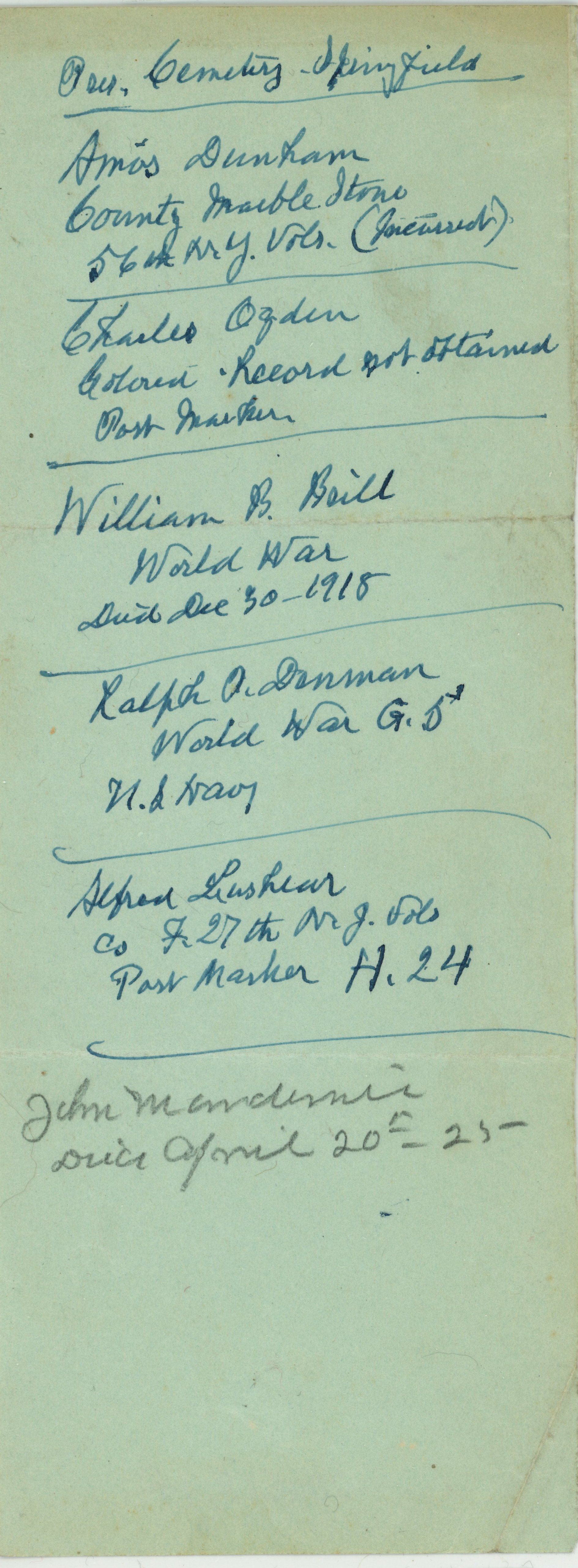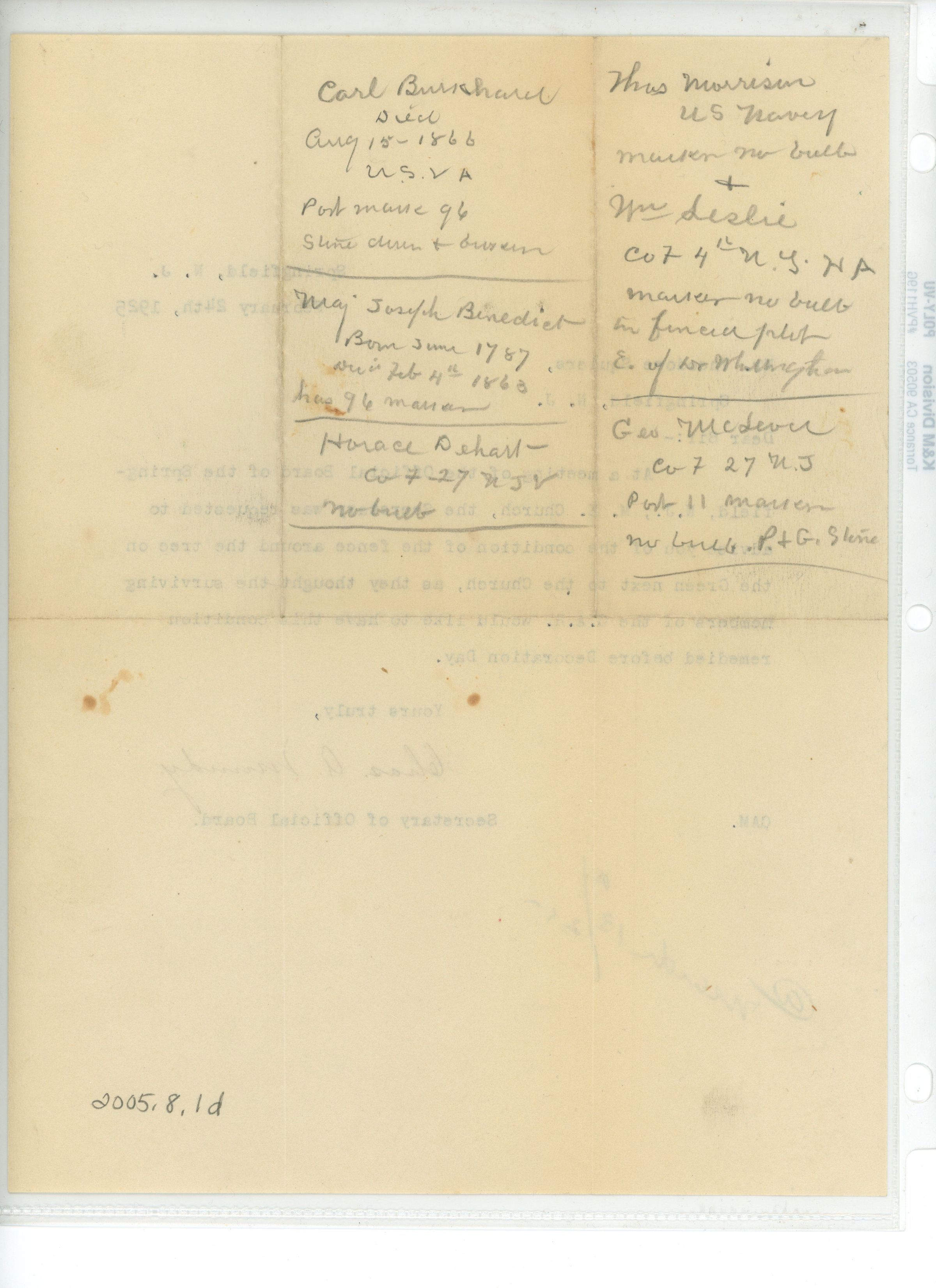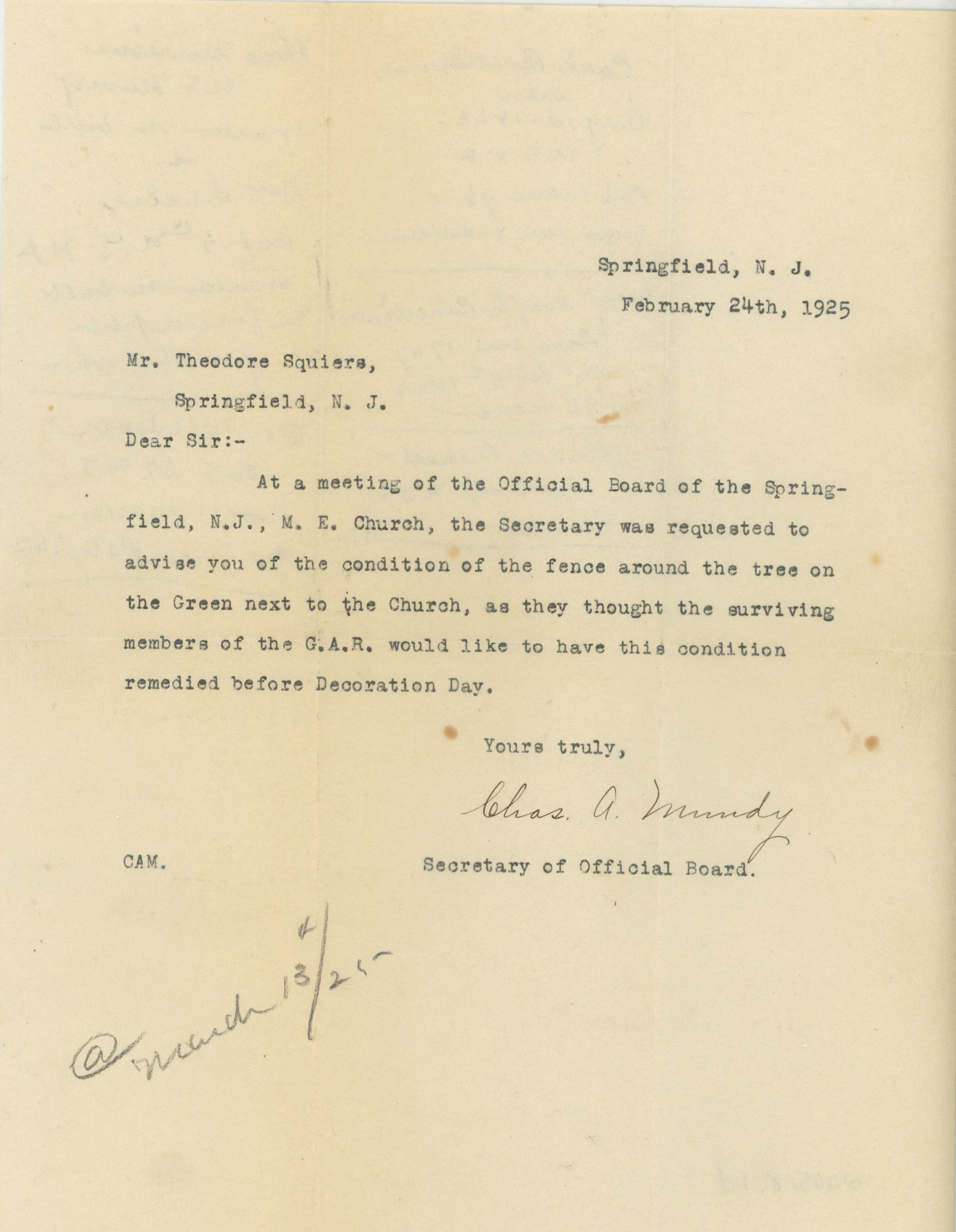 Typewritten letter with handwritten notes on verso from Charles A Mundy to Theodore Squires dated February 24, 1925 advising Spires that the condition of the fence at the cemetery was in need of repairs and recommending it be done before Decoration Day, when members of the G.A.R. would be visiting. Notes of soldiers buried in Springfield on verso of letter. Handwritten list of veterans graves in Springfield on second page.Acquisition