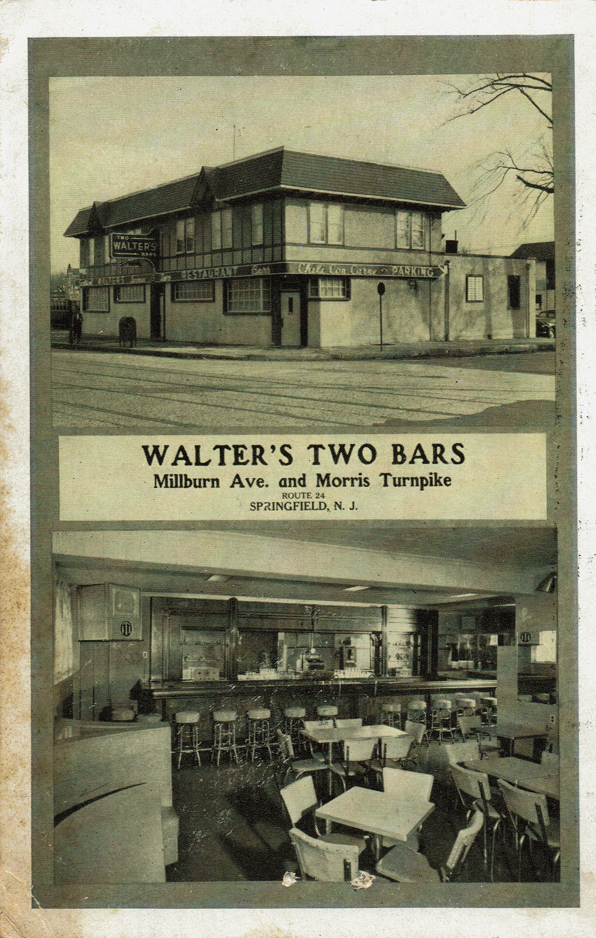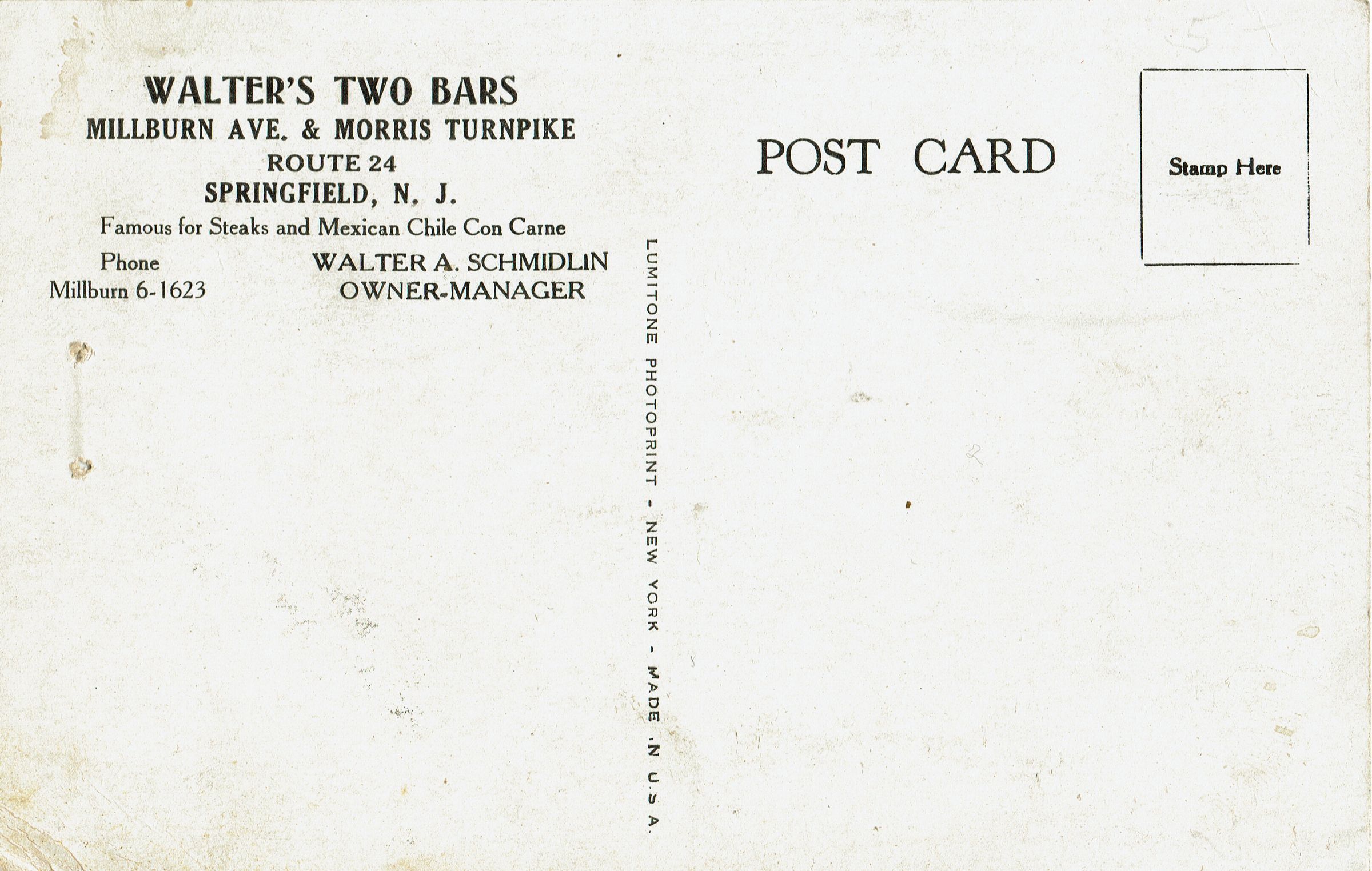 Postcard of Walter's Two Bars, Millburn Avenue and Morris Turnpike, Route 24, Springfield, N.J., c. 1950s. Verso of card lists Walter A. Schmidlin as Owner-Manager. Famous for Steaks and Mexican Chile Con Carne.Acquisition