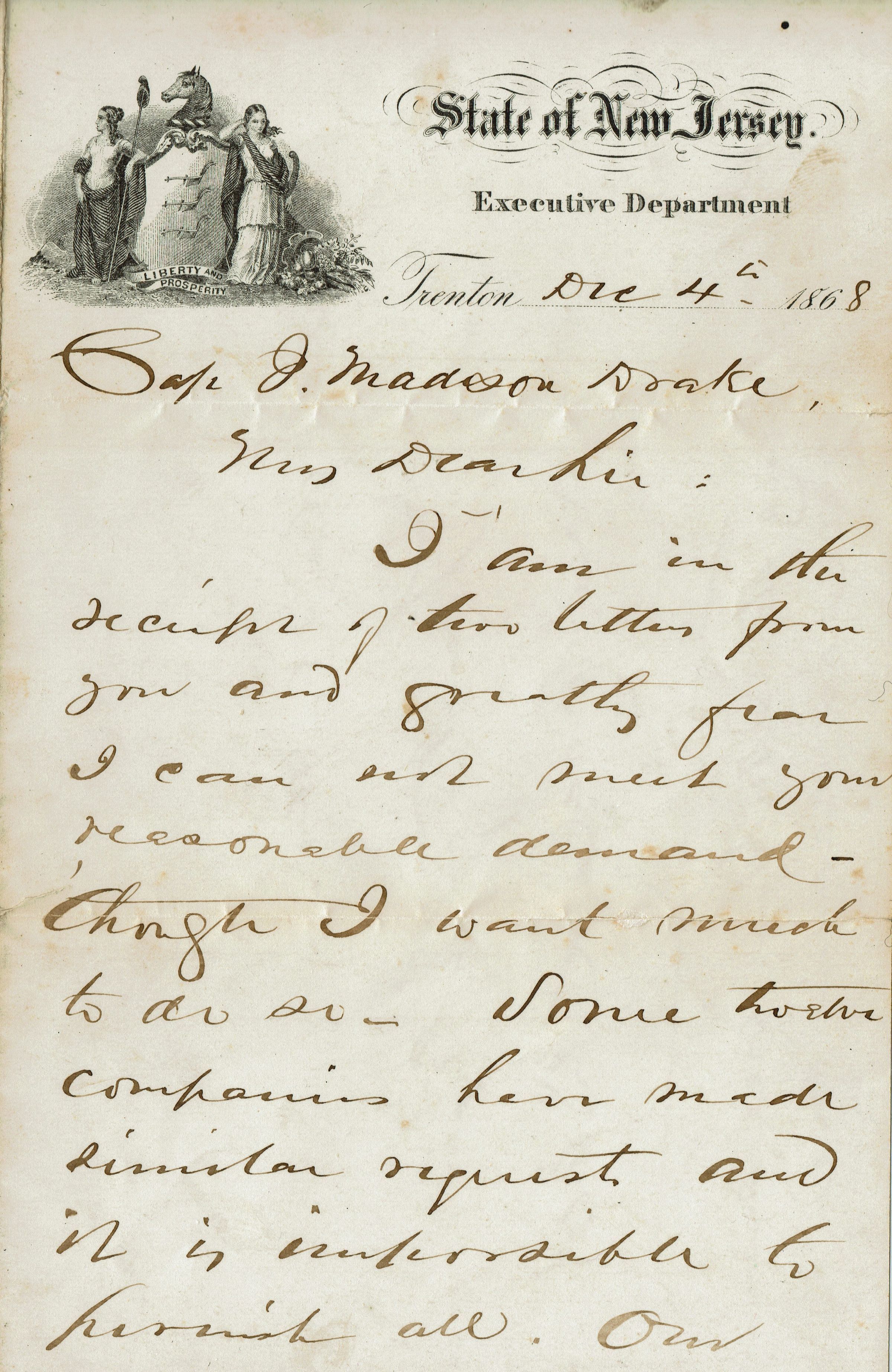 Three page handwritten letter from New Jersey Governor Marcus L. Ward to James Madison Drake dated Trenton, December 4, 1868.