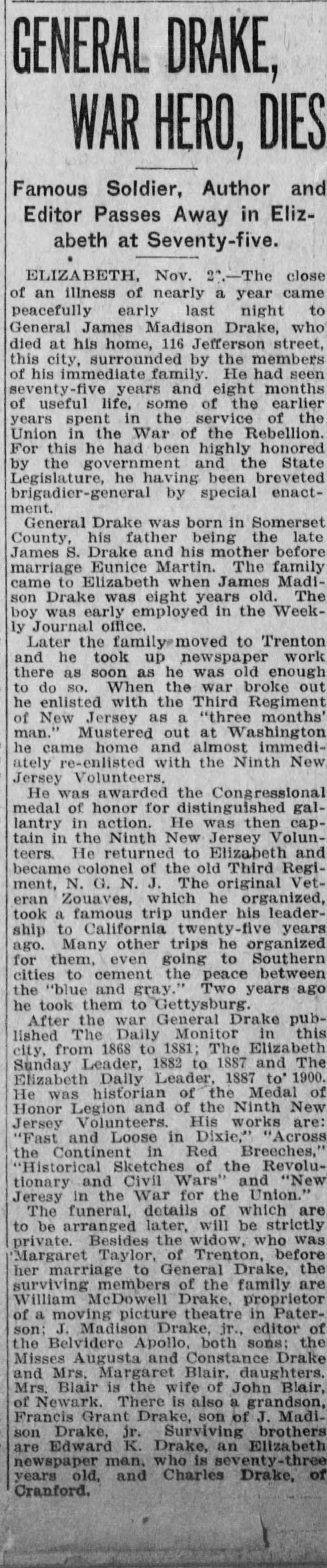 After the war, he served in the New Jersey National Guard, rising to the rank of Colonel. Drake died November 28, 1913.