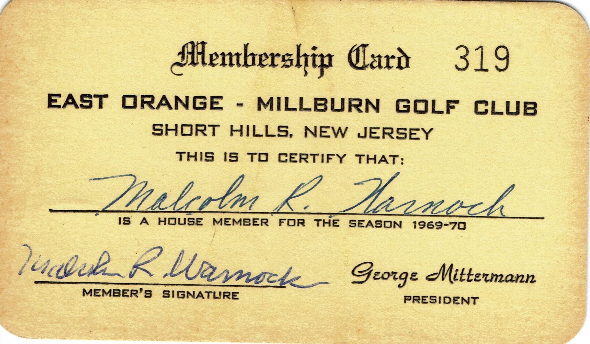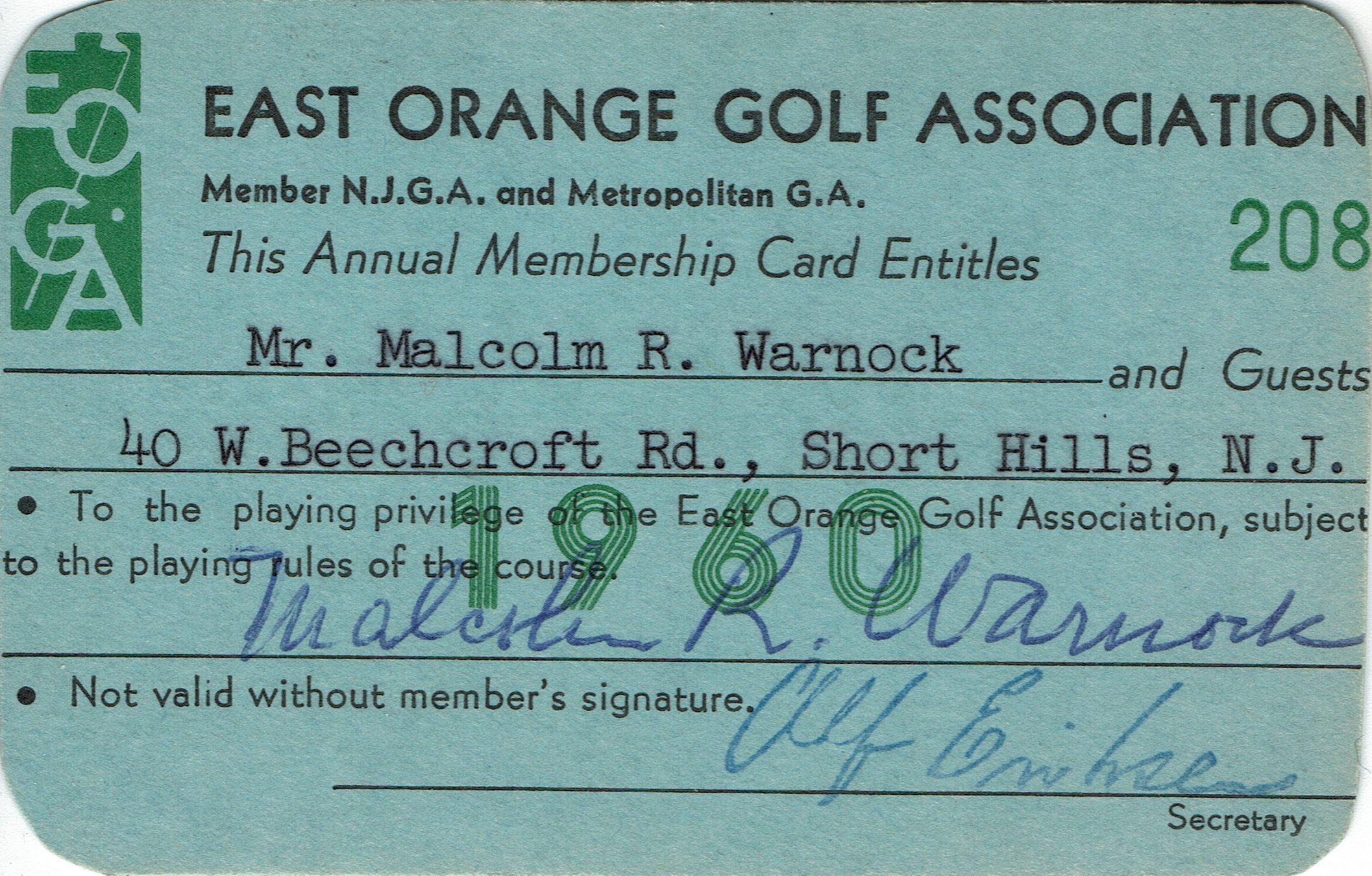 Membership cards to the East Orange Golf Association & East Orange-Millburn Golf Club issued to Malcolm Warnock, 40 West Beechcroft Road, Short Hills, NJ for the years 1960 and 1969-70.Acquisition