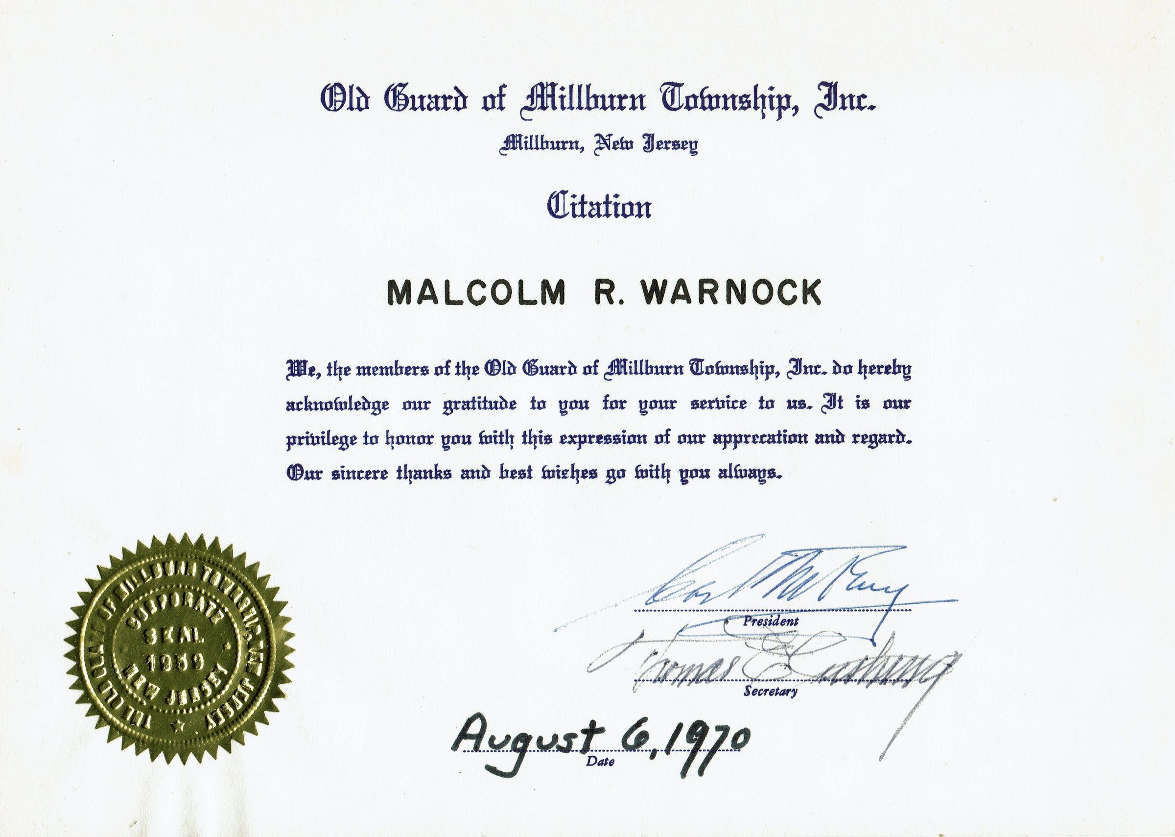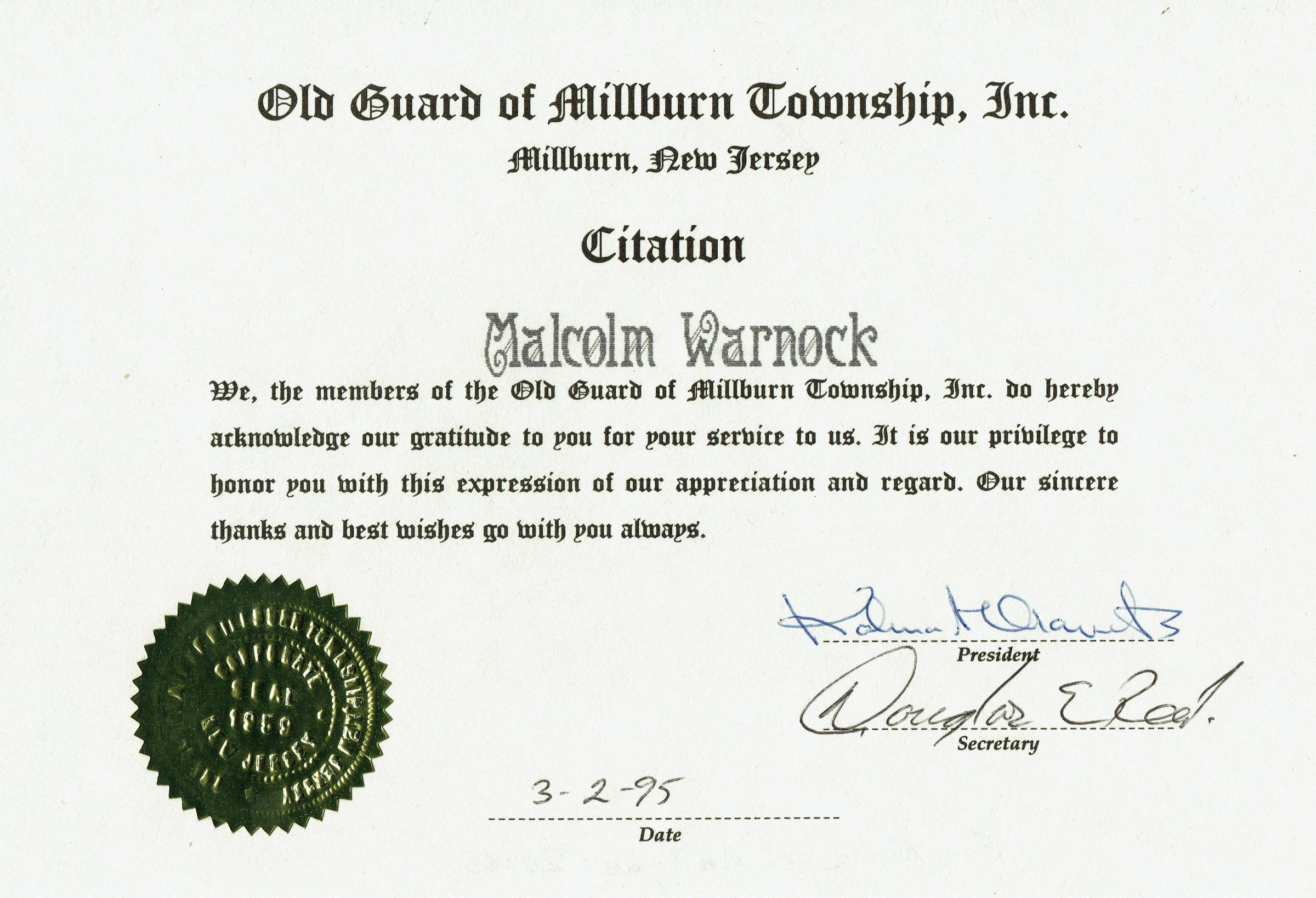 Citations from the Old Guard of Millburn Township, Inc., Millburn issued to Malcolm Warnock for his service from March 2, 1995 and August 6, 1970Collection