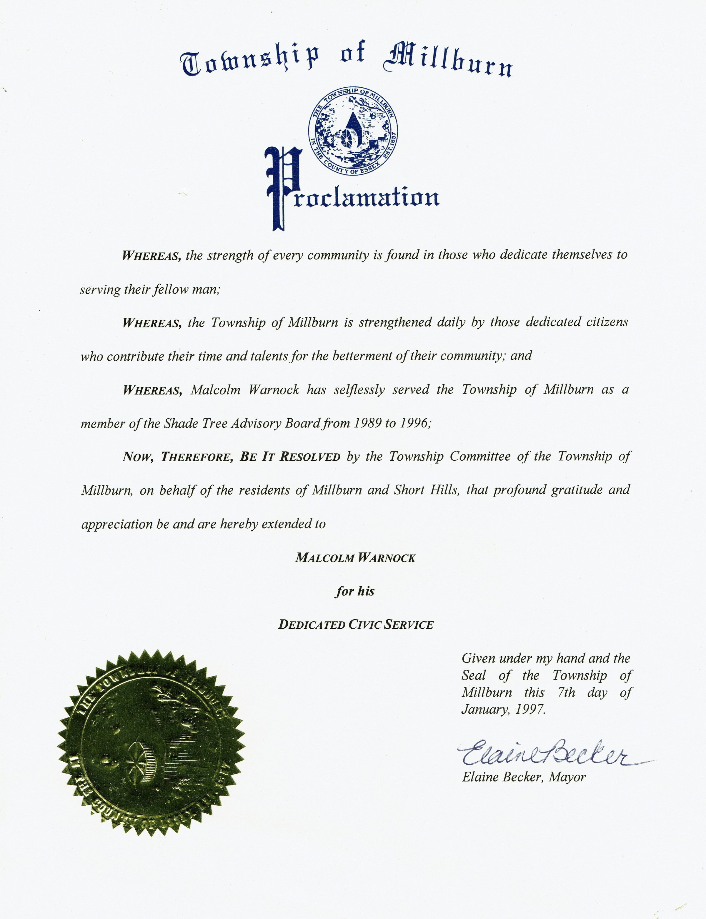 Municipal Proclamation issued to Malcolm Warnock for his service on the Shade Tree Advisory Board from 1989-1996, issued on January 7, 1997 and signed by mayor Elaine Becker.Collection