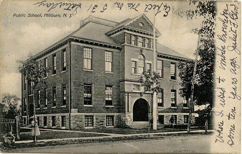 Pre-1907, real photo postcard of the old Washington School at 374 Millburn Avenue. The postcard was sent to Mrs. Hannah J. Edwards in (Granby?) CT by Juliet F. Blood. Ms. Blood wrote on the front: "Where I used to imbibe knowledge some ten years ago. Expect me on 5/31 Saturday. Juliet F. Blood" The postcard was stamped "Mar 29" but the year did not stamp on it. The back of the postcard has on it a green one-cent Benjamin Franklin stamp, which was first issued in early 1903. The card has yellowed somewhat, especially around the edges, and has minor edge wear and bumped corners. It was purchased online from: EICHHORN; 6852 S. Webster Way; Littleton CO 80128-4444.Collection