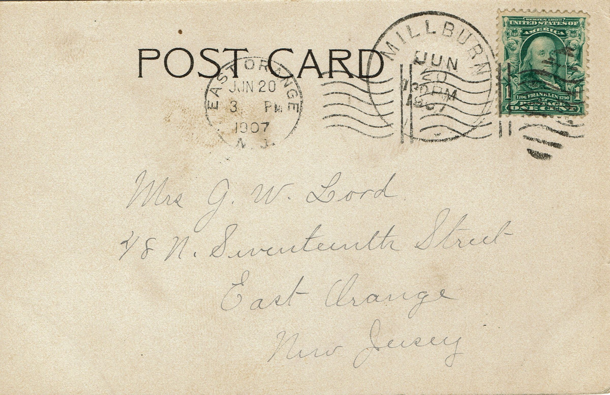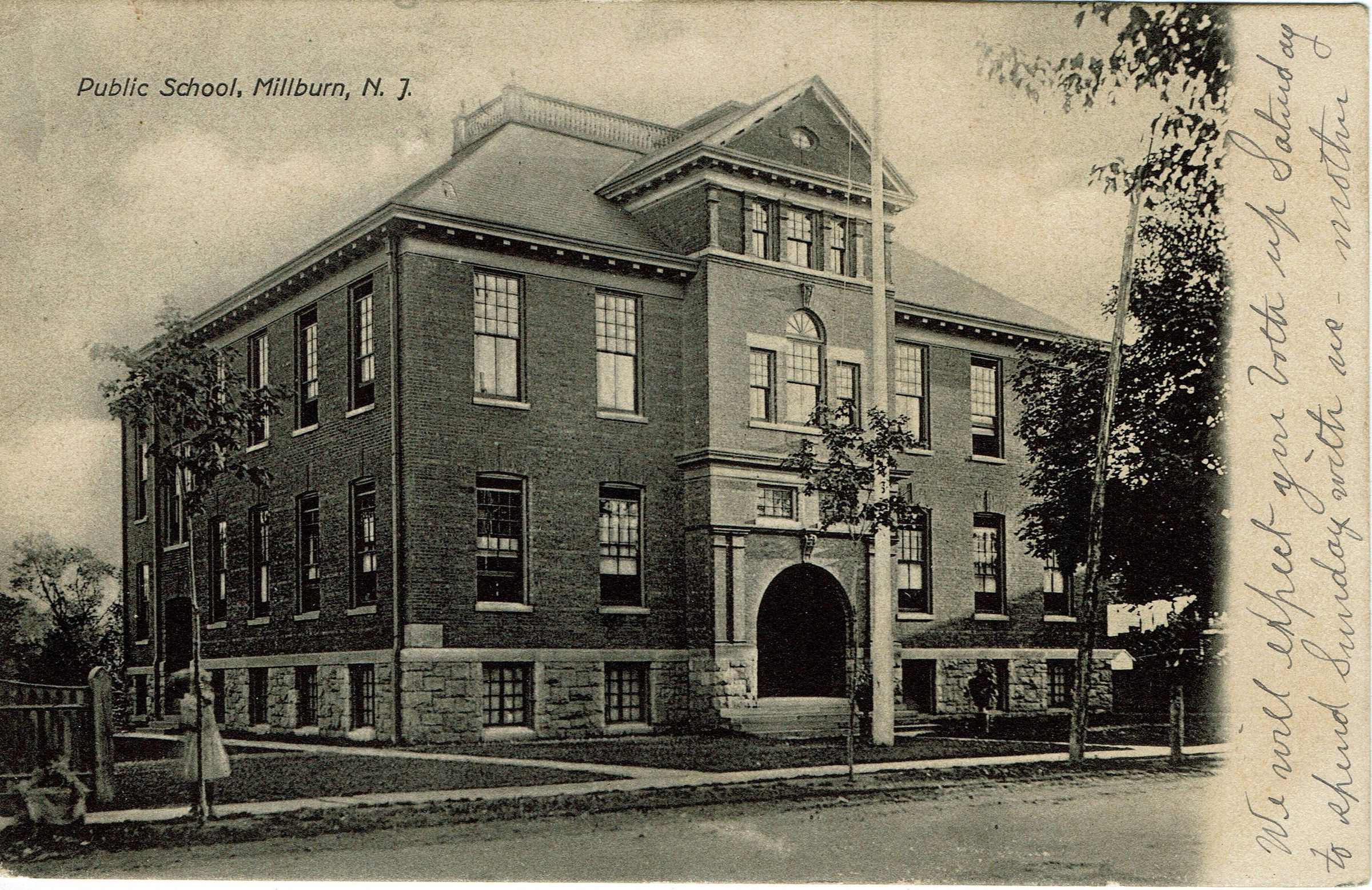 Postally used B&W photographic postcard of the Washington School, Millburn Avenue, Millburn. Postmarked Millburn, June 20, 1907 and sent to Mrs. G.W. Lord 48 North Seventeenth Street, East Orange, NJ. Message on front of card reads: "We will expect you both up Saturday to spend Sunday with us. Mother"Collection