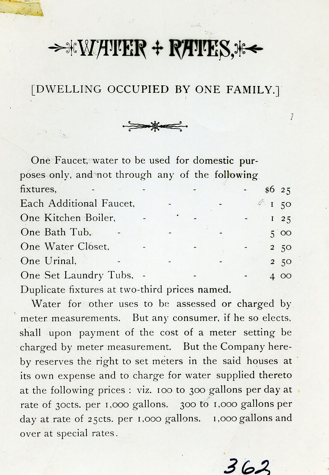 Water Rates for Dwelling Usage, March 11, 1891