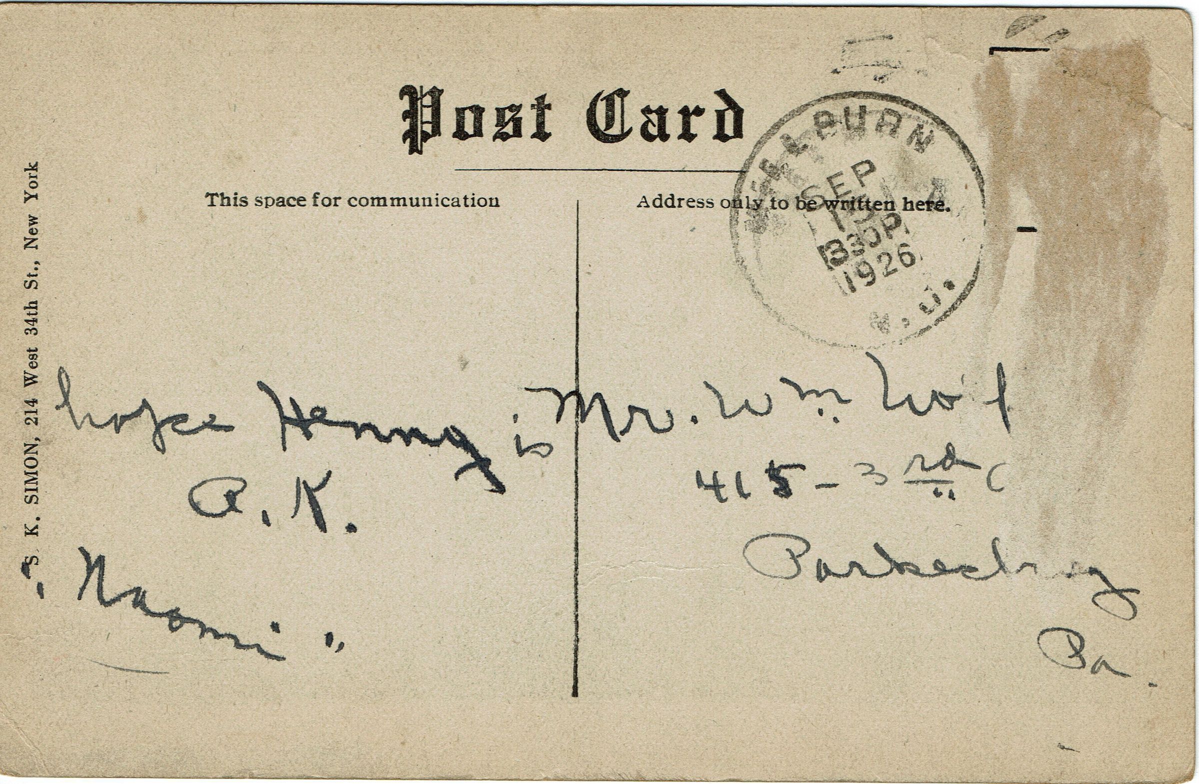 Photographic postcard of the water works or pumping station at Campbell's Pond in South Mountain Reservation. Postally used, postmarked Millburn, September 15, 1926, 3:30 pm.Collection