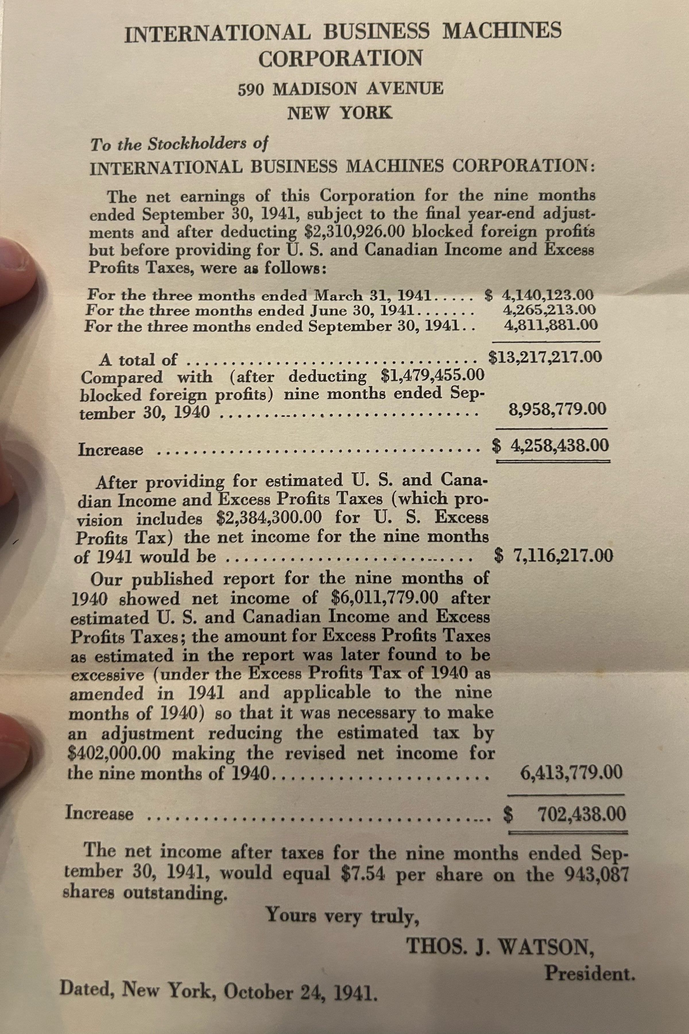 Letter to IBM stockholders from Thomas J. Watson detailing their net earnings and taxes. It then details net income on each share. Dated October 14th 1941.