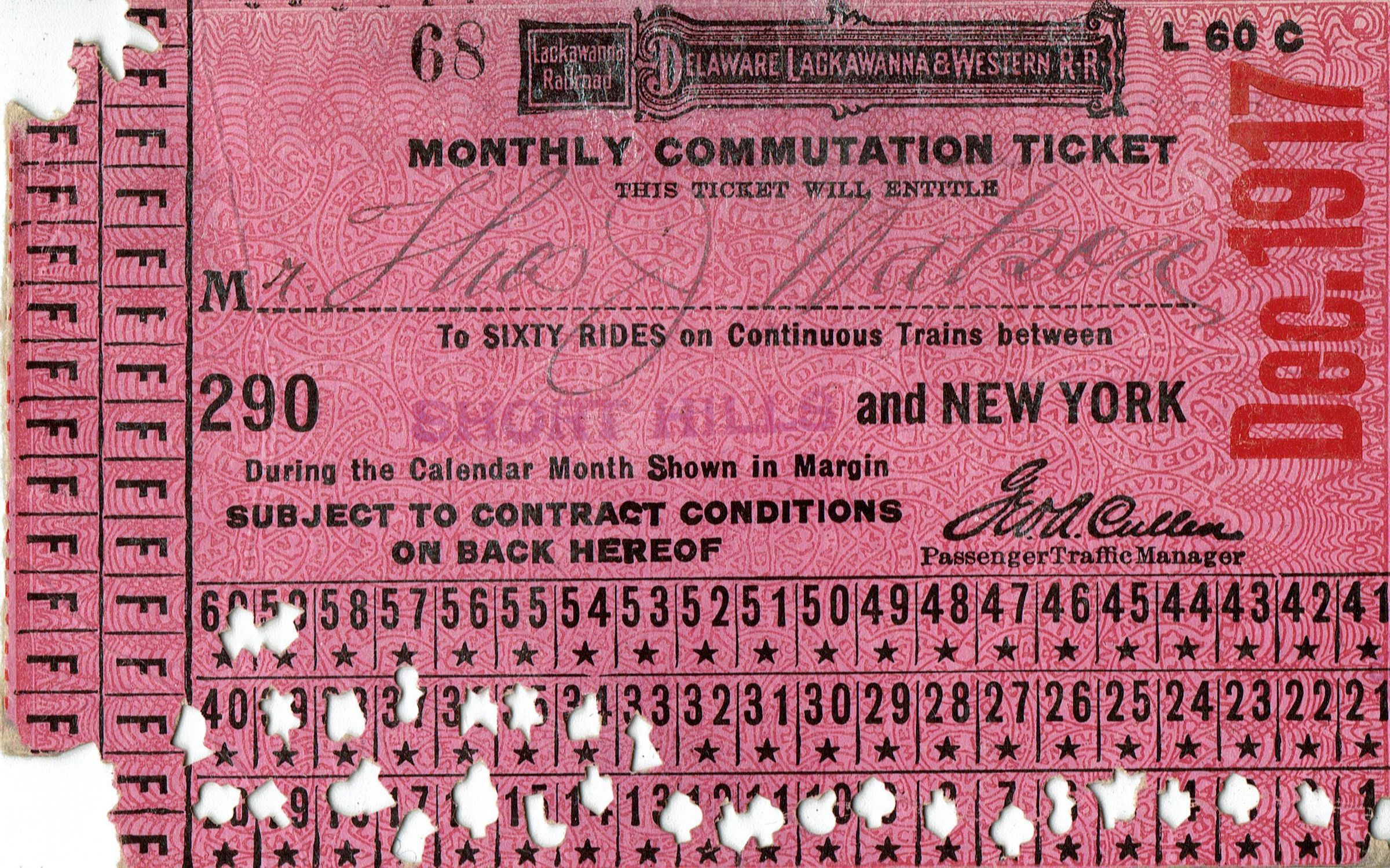 December 1917 Delaware, Lackawanna & Western monthly commutation ticket for Short Hills and New York. Originally belonged to and signed by Thomas. J. Watson.Acquisition