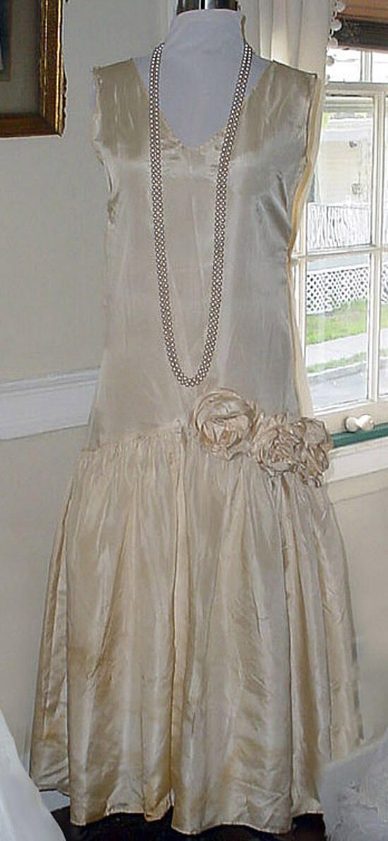 1930 wedding gown for Lillian Swain Trowbridge . Made of China silk at the beginnning of the depression, this gown shows the influence of the 1920's in its straight austere bodice and simple flounced skirt . Gown was laid flat and measured side to side at the waist for the width. Length was measured from shoulder to hem. Its only decorations are its three lush cabbage roses. Overall shattering of silk. Lillian Swain married September 3, 1930.Acquisition