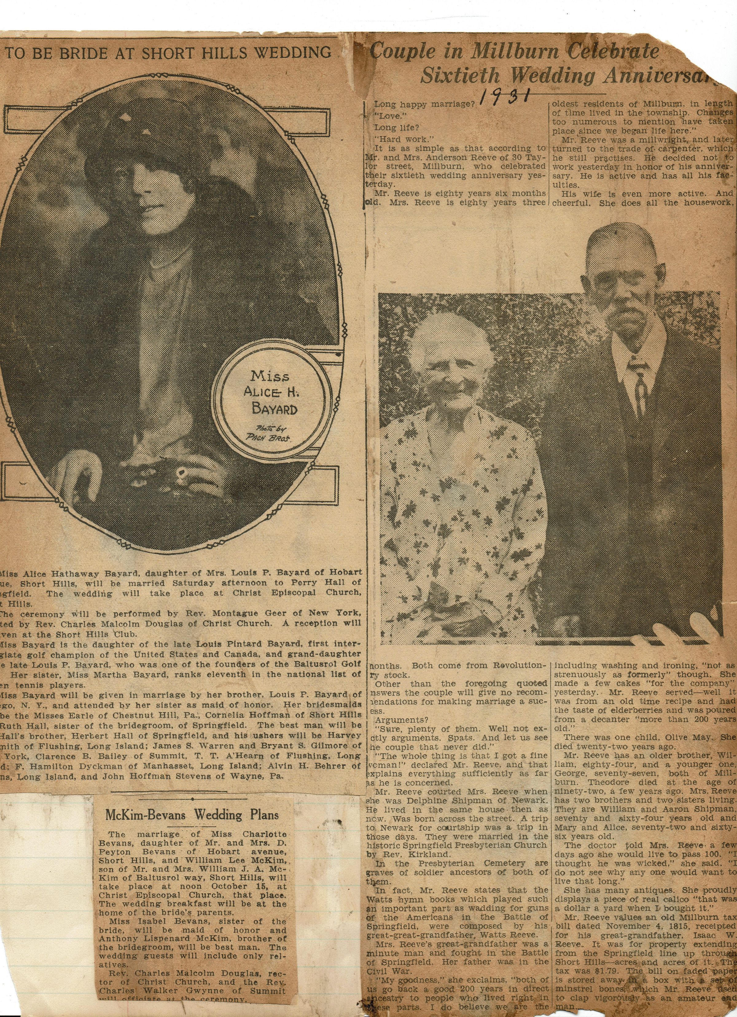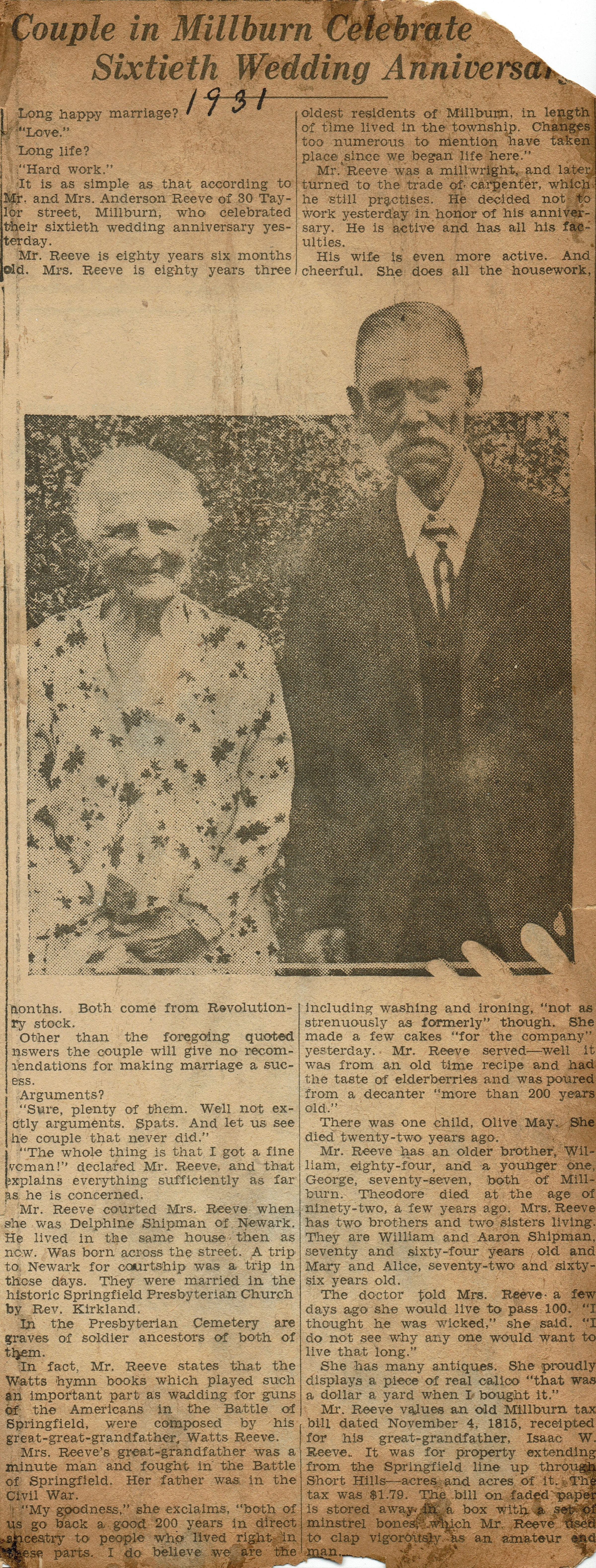 Article from Mrs. Herman Wehrle's scrapbook describing the 60th anniversary of Mr. and Mrs. Anderson Reeve of 30 Taylor Street, Millburn. Article tells how Mr. Reeve began as a millwright and then became a carpenter. Both trace their ancestors to the Revolutionary War.Acquisition
