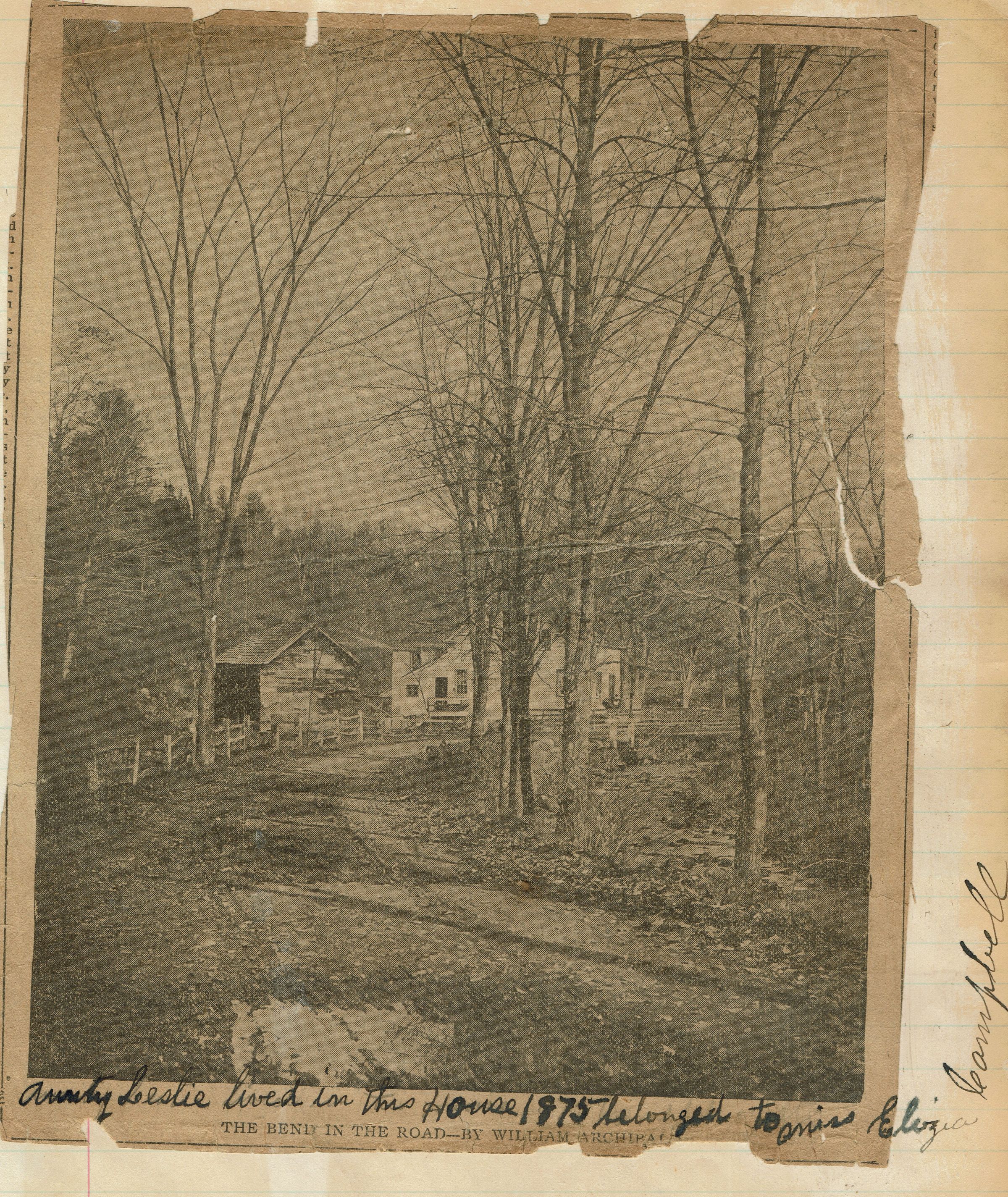 Newspaper clipping of Photograph of a painting "The Bend in the Road" by William Archibald (possibly William Archibald wall) with the handwritten inscription: "Aunty Leslie lived in this house/1875 belong to Miss Eliza Campbell."Acquisition