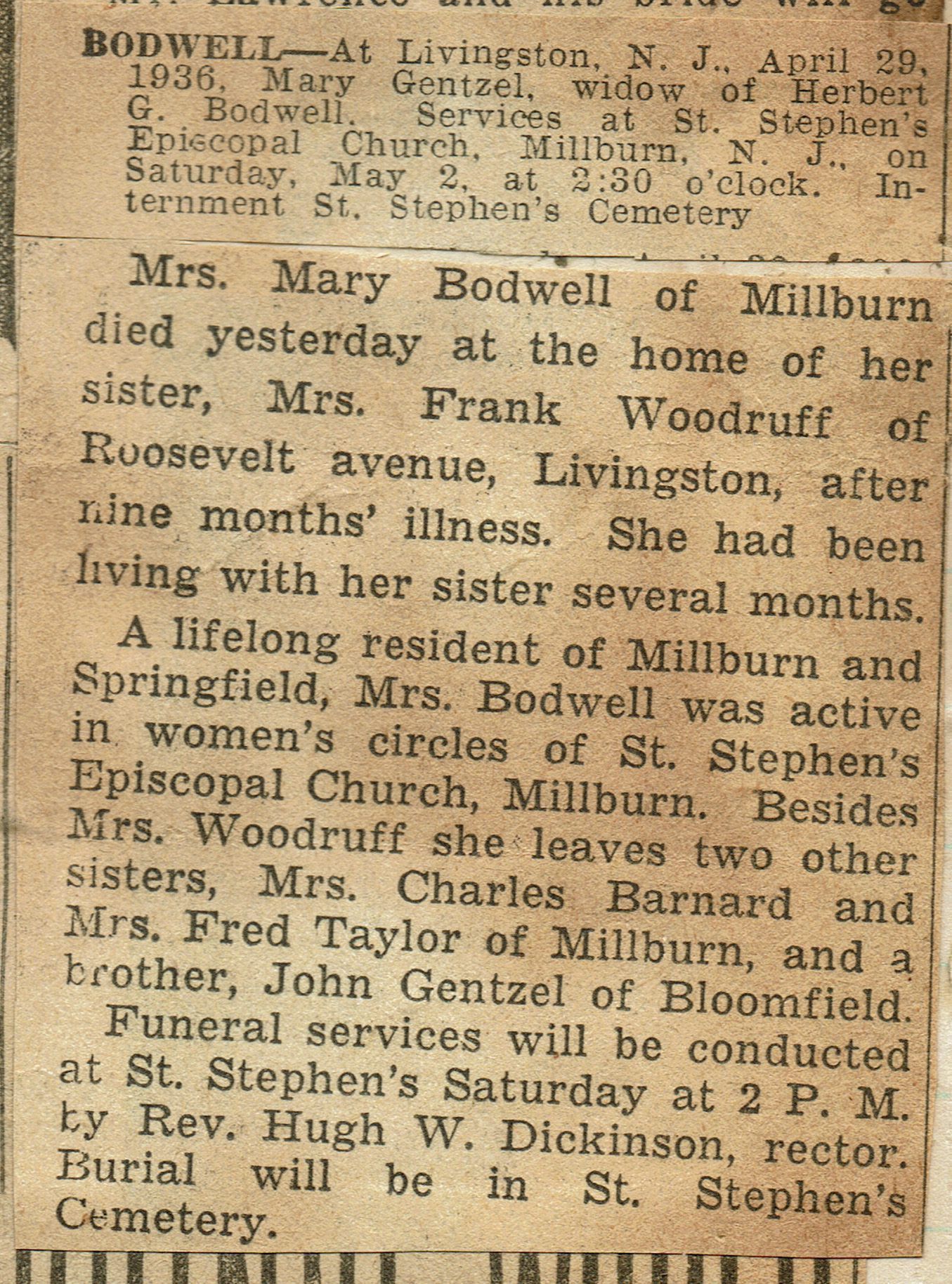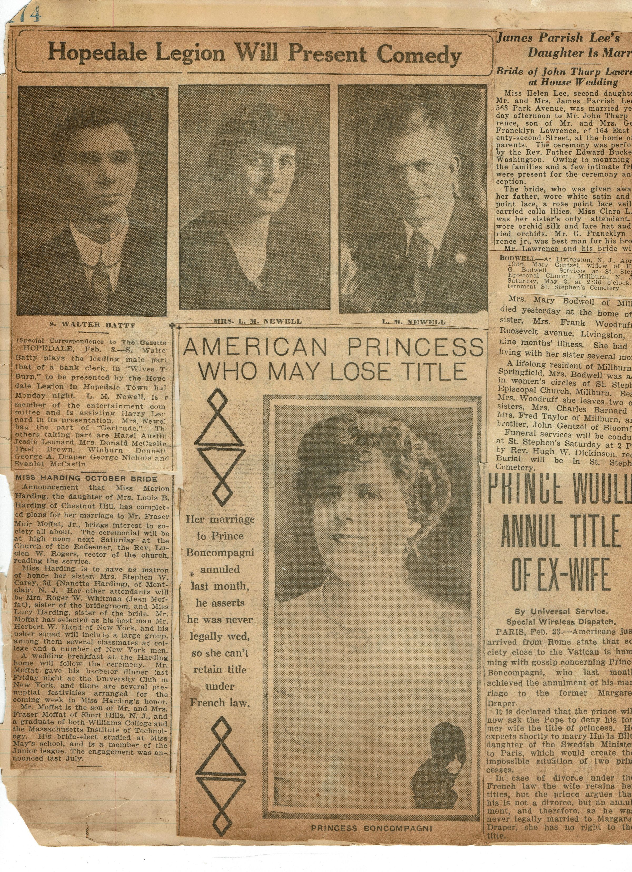 Page from Mrs. Herman Wehrle Scrapbook with newspaper clippings relating to family and friends from Millburn including: Mary Gentzel Bodwell's obituary (April 1936), Wedding of Marion Harding to Fraser Muir Moffat, Jr. of Short Hills.Acquisition