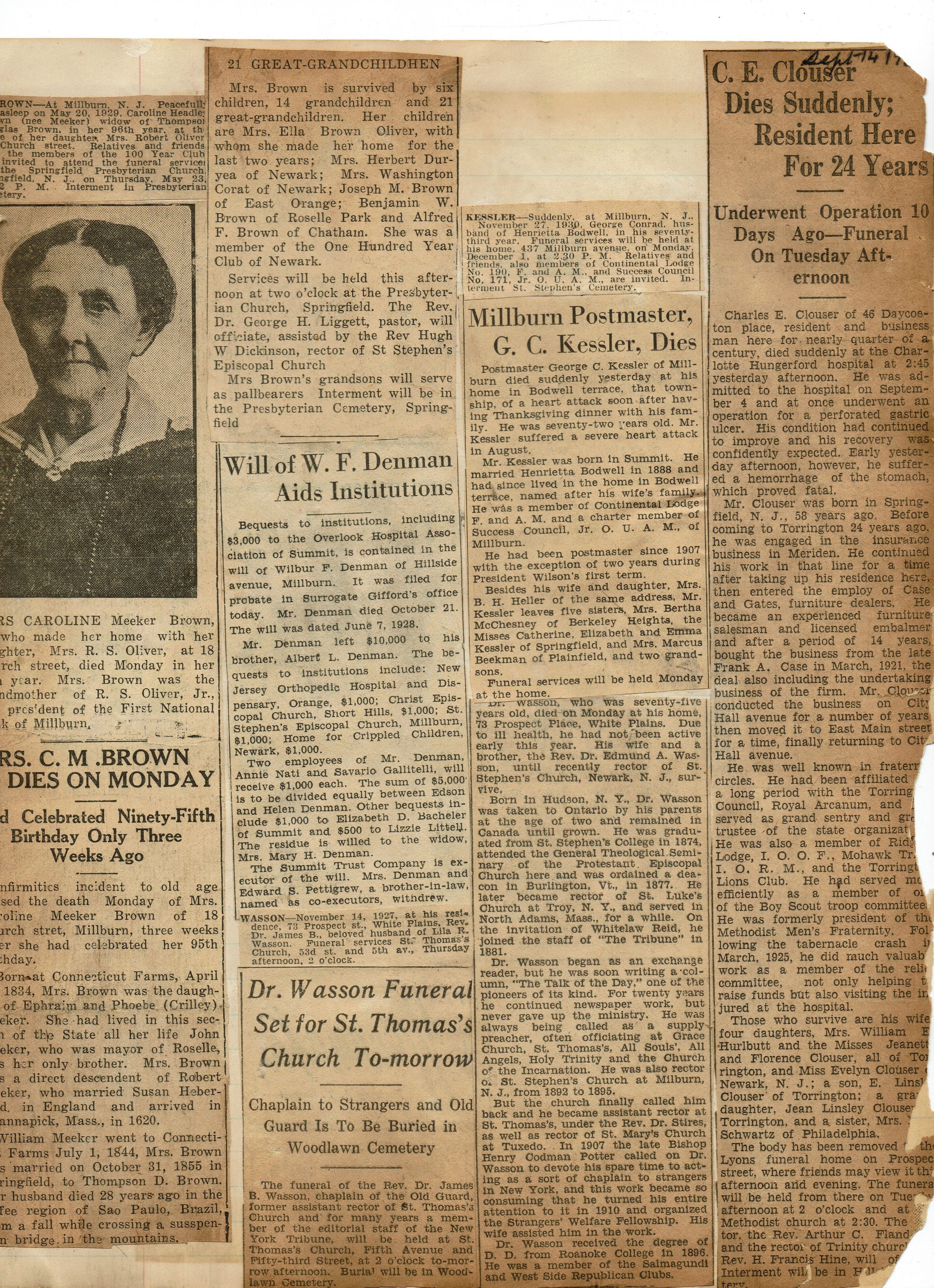 Page from Mrs. Herman Wehrle Scrapbook with obituaries of family and friends from Millburn including: Caroline Meeker Brown (May 1929)--mother of Mrs. R.S. Oliver, Wilbur F. Denman, George Conrad Kessler (November 1930).Acquisition