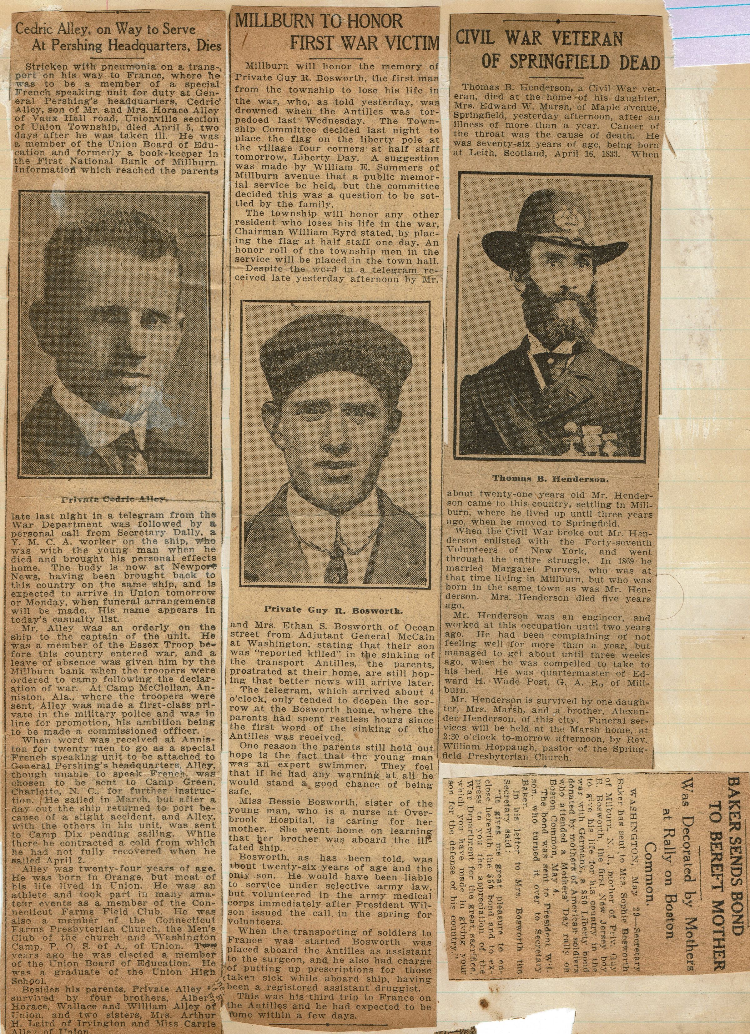 Page from Mrs. Herman Wehrle's scrapbook containing obituaries of men who served in the military including: Guy R. Bosworth (October 1917), Thomas B. Henderson (1899), who was quartermaster of the Edward H. Wade Post, G.A.R. of Millburn, and Cedric Alley (from Union).