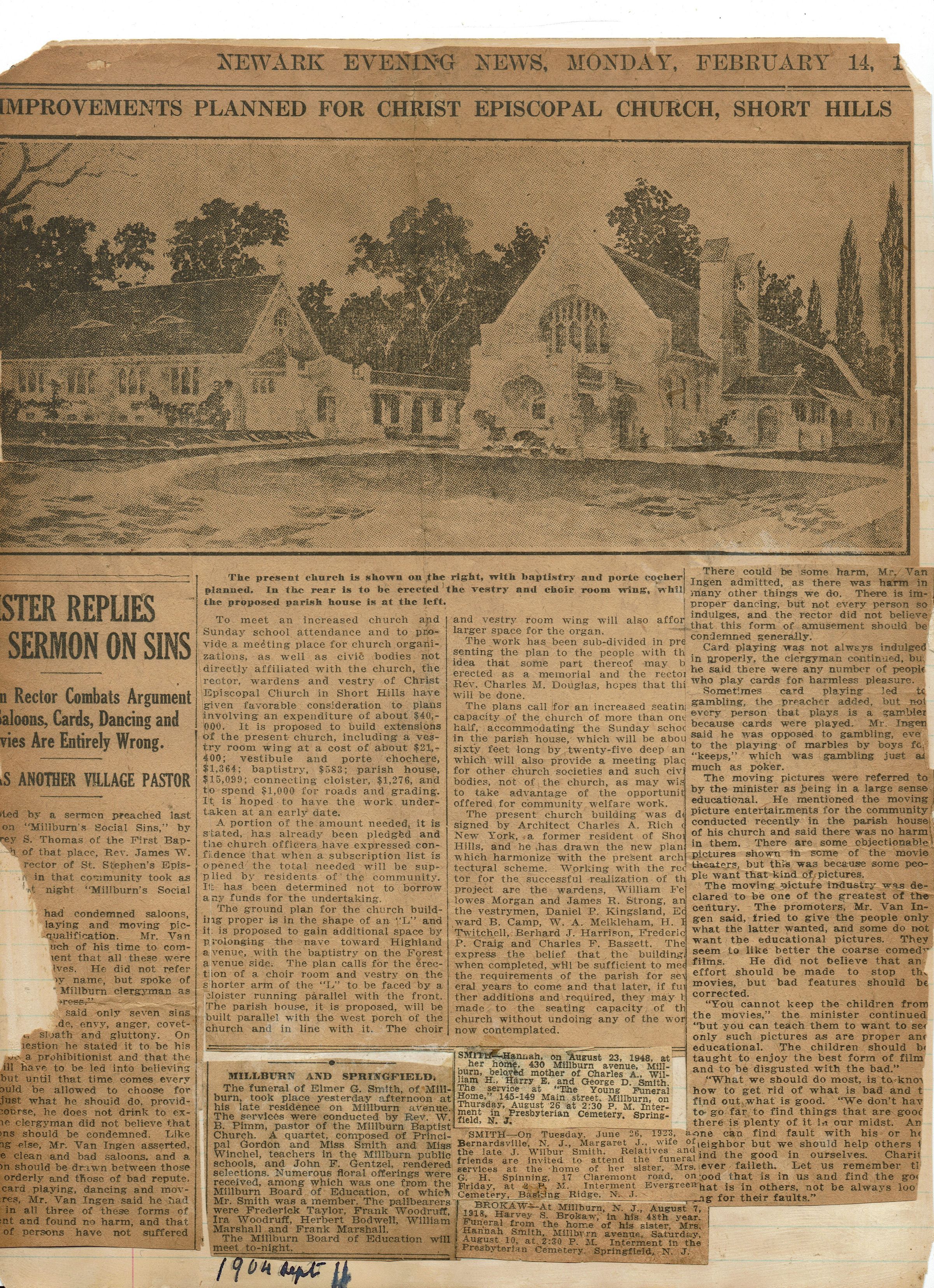 Page from Mrs. Herman Wehrle's scrapbook containing a newspaper clipping about improvements to Christ Church and obituaries for: Elmer G. Smith (September 1904), Hannah Smith (August 1948), Margaret Smith (June 1923), Harvey S. Brokow (August 1918).Acquisition