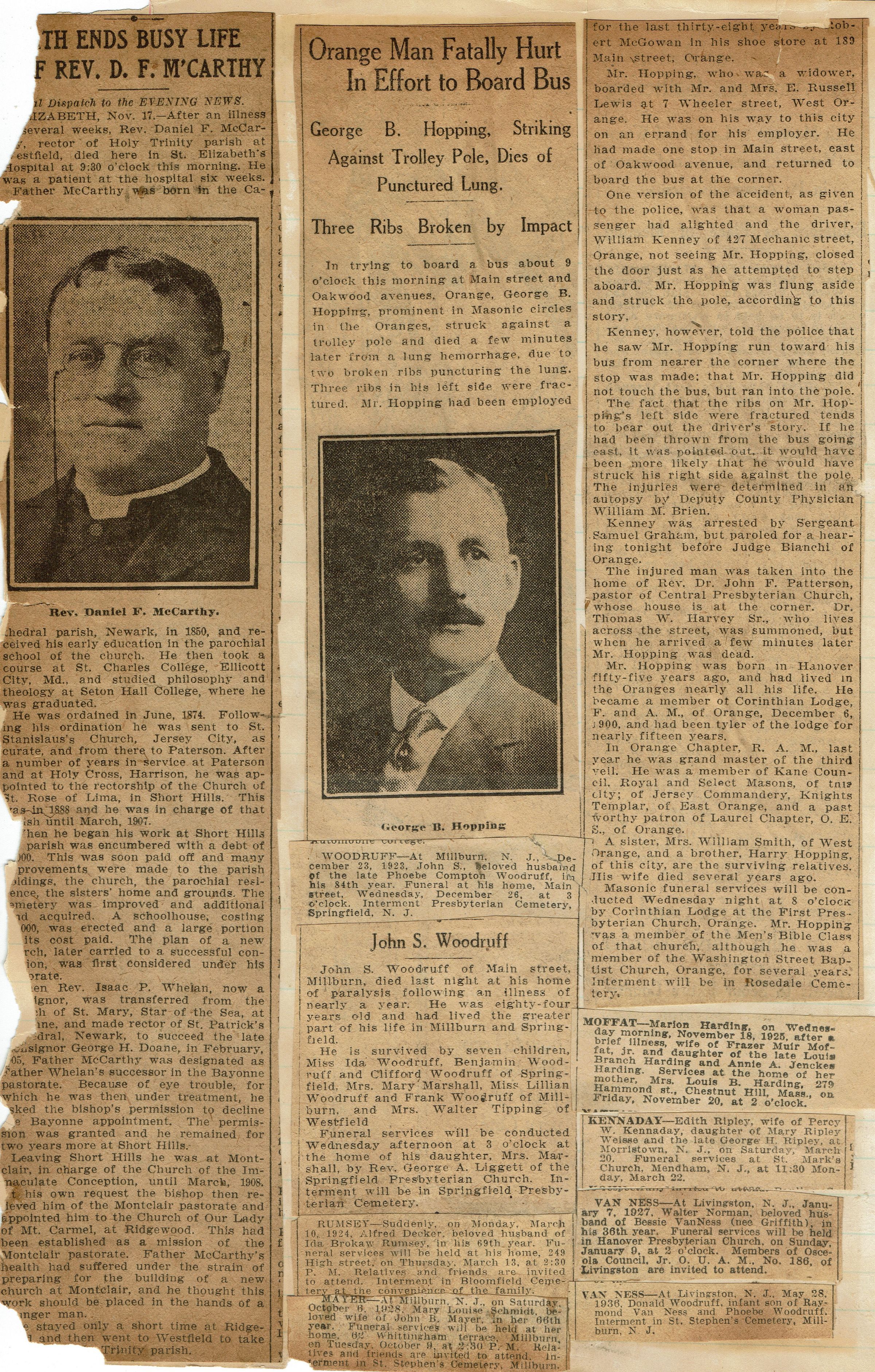Page from Mrs. Herman Wehrle's scrapbook containing obituaries of Millburn friends and family: Reverend Daniel F. McCarthy, John S. Woodruff (December 1923), Mary Louise Mayer (October 1928), Marion Harding Moffat (November 1925),Acquisition