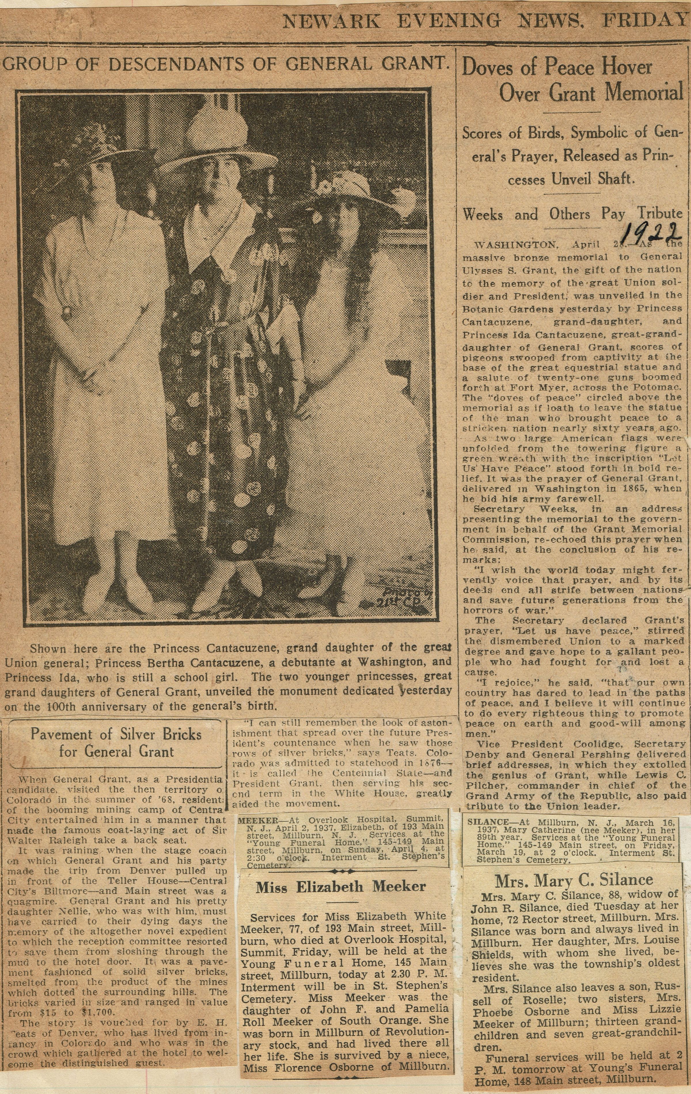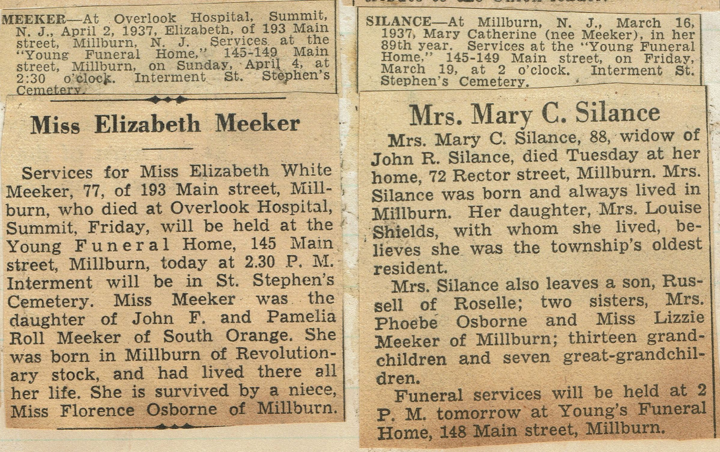 Page from Mrs. Herman Wehrle Scrapbook with obituaries of family and friends from Millburn including: Elizabeth White Meeker (April 1937) of 193 Main Street and Mary C. Silance (March 1937), widow of John R. Silance of 72 Rector Street, Millburn.Acquisition