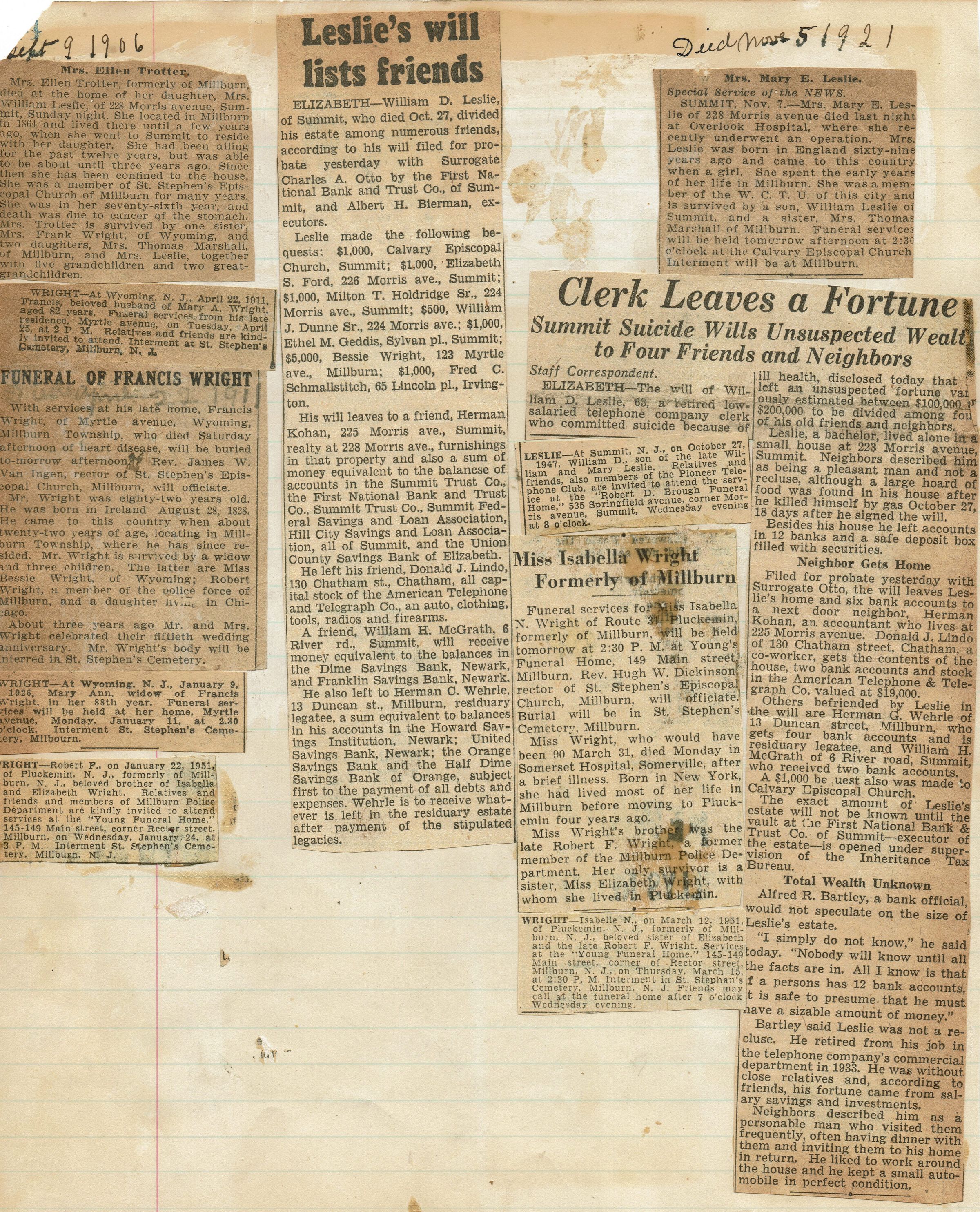 Page from Mrs. Herman Wehrle Scrapbook with obituaries of family and friends from Millburn including: Ellen Trotter, Francis Wright, Mary E. Leslie, Mary Ann Wright, William Leslie, Isabella Wright.Acquisition