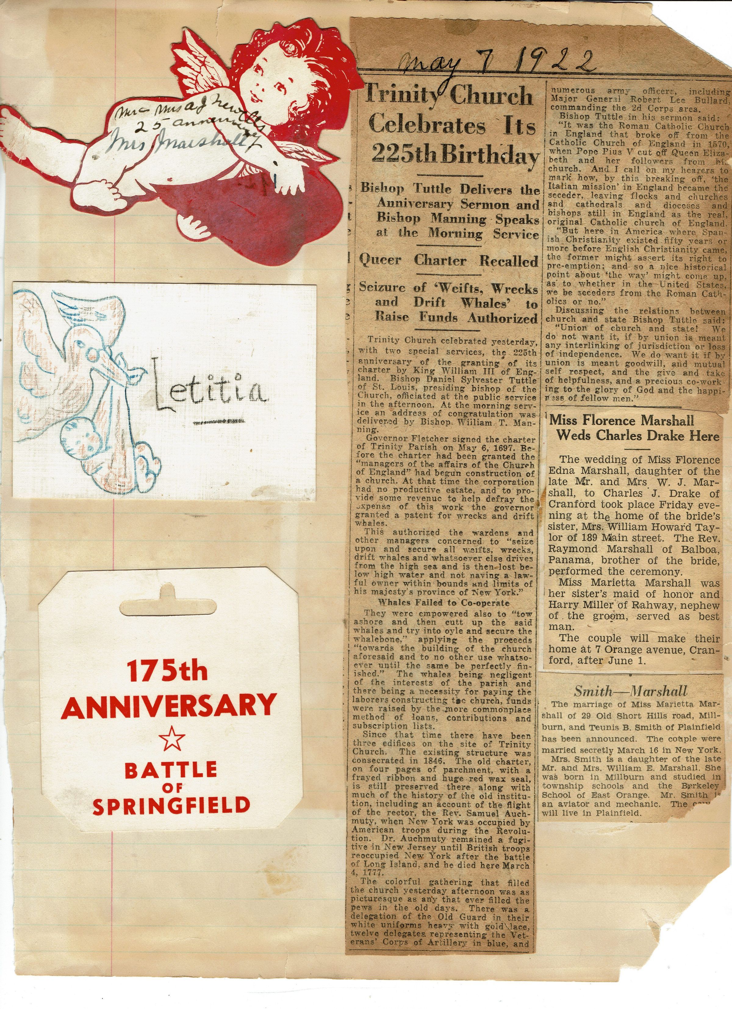 Page from Mrs. Herman Wehrle's scrapbook containing newspaper clippings relating to the marriages of Florence Marshall to Charles Drake and Marietta Marshall (29 Old Short Hills Road) to Teunis B. Smith. There is also a tag from the 175th Anniversary celebration of the Battle of Springfield.Acquisition