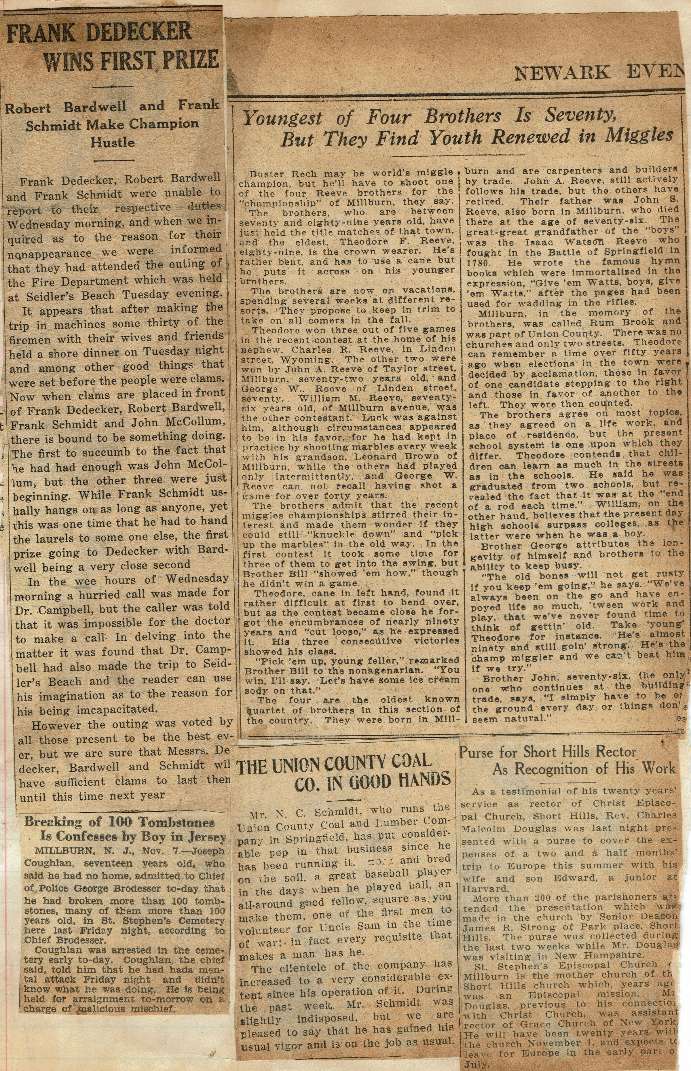 Page from Mrs. Herman Wehrle's Scrapbook containing newspaper clippings relating to Millburn people and events. Frank Dedecker, Robert Bardwell, Frank Schmidt, Johmn McCollum at Fire Department outing, N. C. Schmidt's work at the Union County Coal Company, recognition of Christ Church rector Charles Malcom Douglas, (Reeve Brothers) Charles R. Reeve, John A. Reeve, George W. Reeve, William M. Reeve champion Miggles players.Acquisition