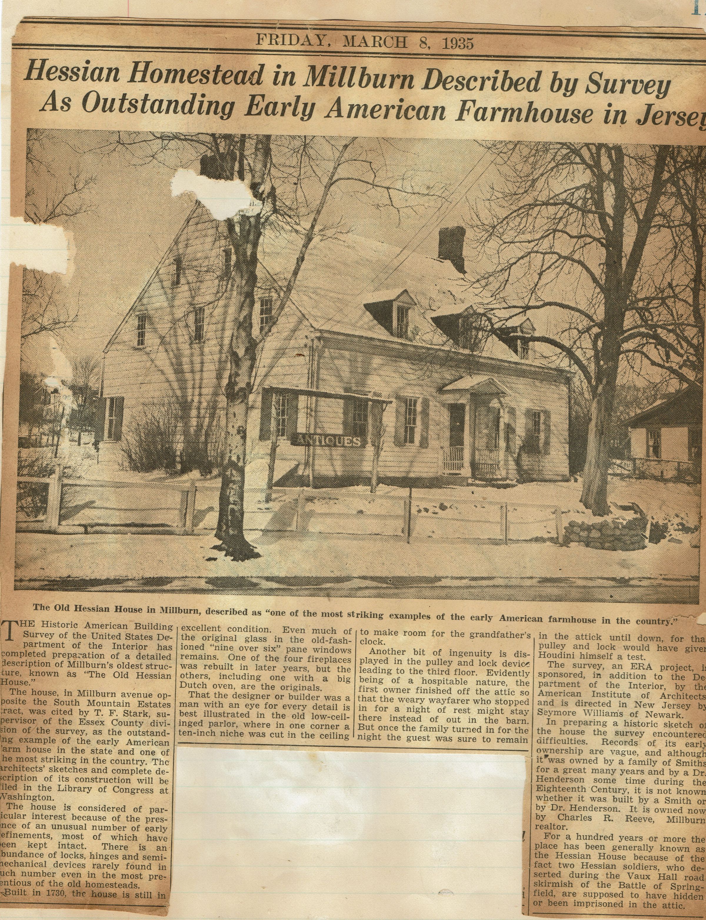 Newspaper Clipping from the Herman Wehrle Scrapbook featuring an article from the March 8, 1935 edition of the Newark Evening News on the Hessian Homestead (155 Millburn Avenue). The article discusses a citation by T.F. Stark, supervisor of the Essex Country division of the US Department of the Interior survey of historic buildings, considering the house "as the outstanding example of the early American farmhouse in the state and one of the most striking in the country."Acquisition