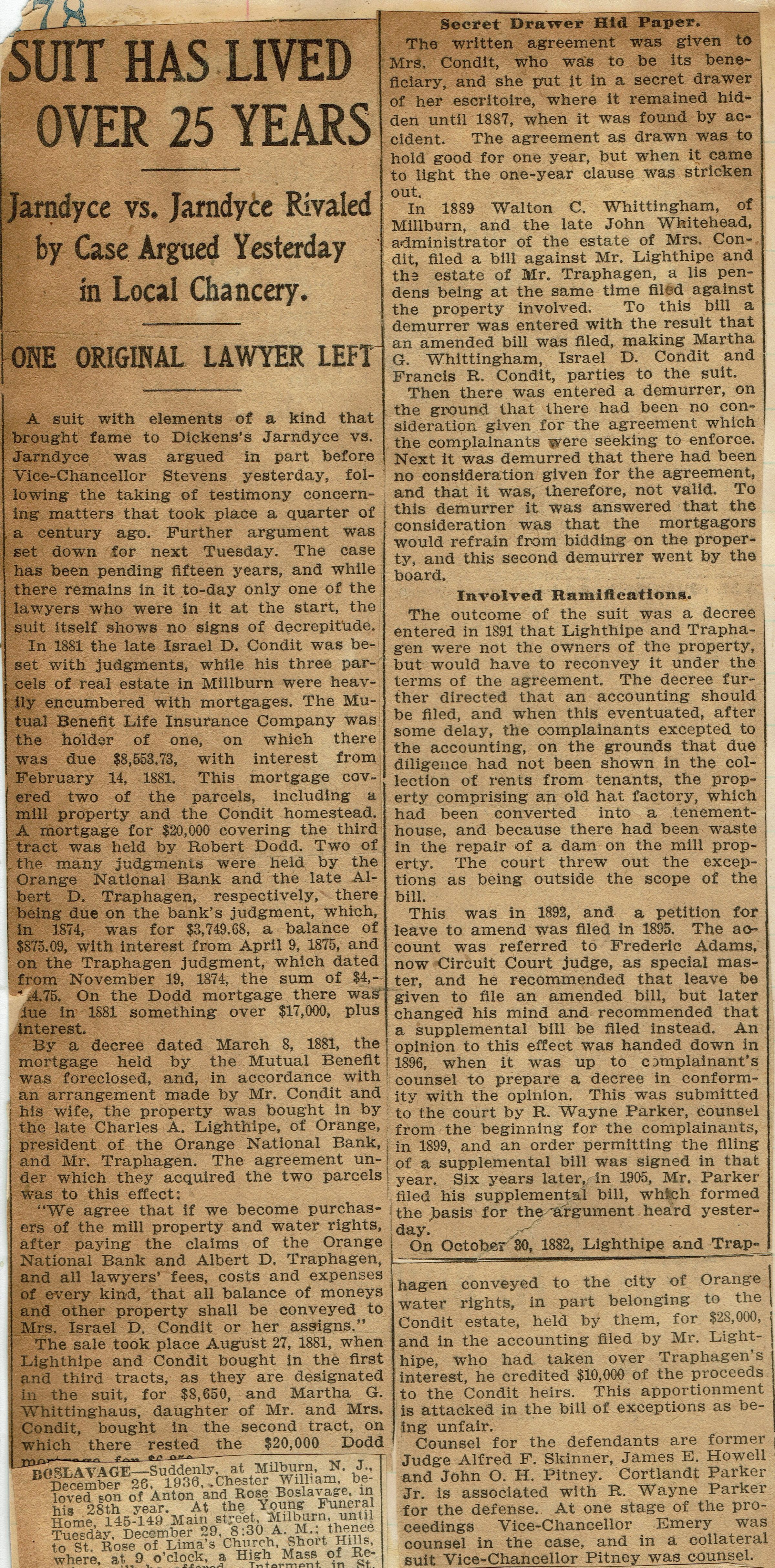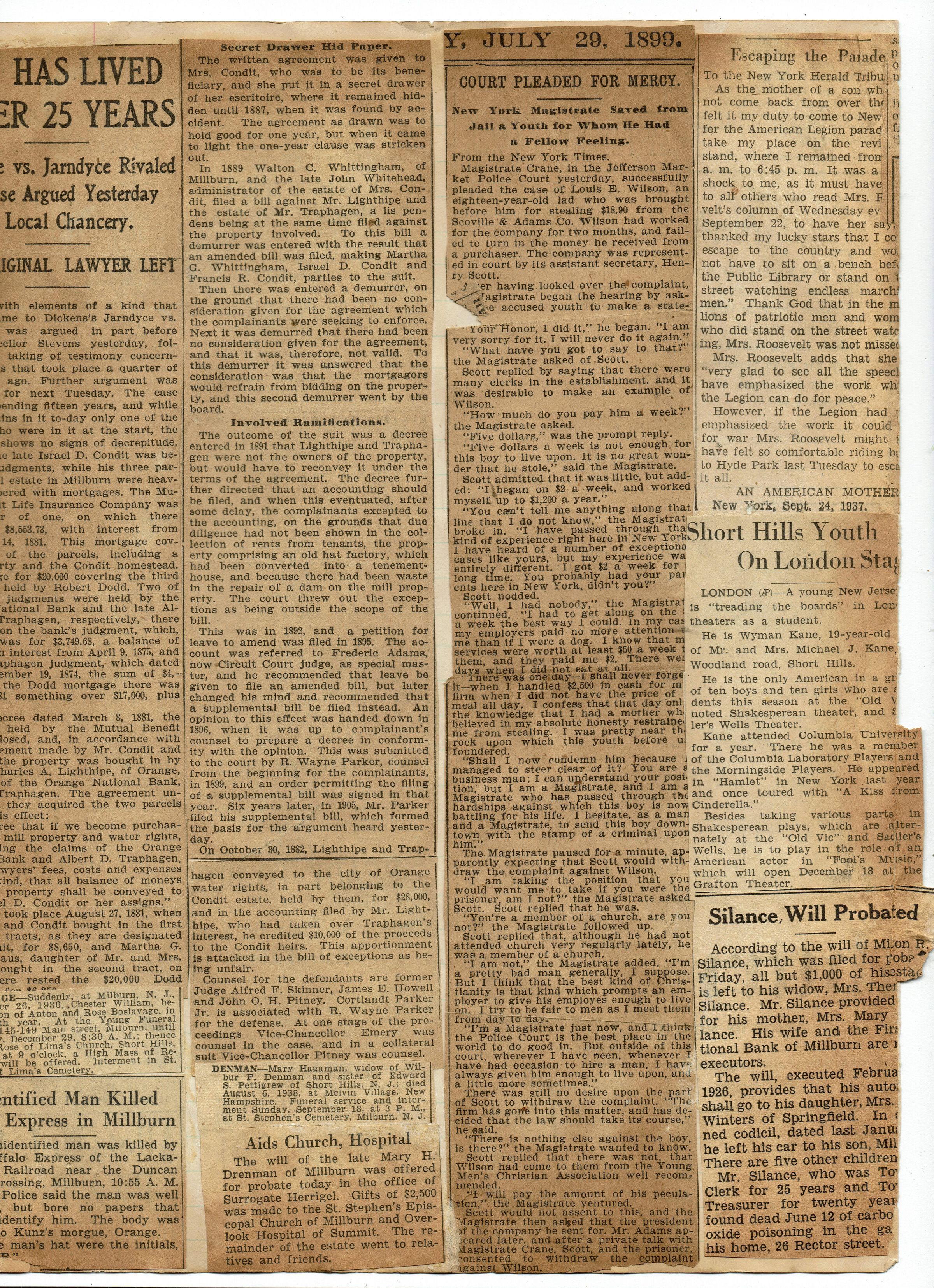 Page from Mrs. Herman Wehrle's scrapbook containing a clipping from the March 17, 1906 edition of the Newark Evening News about a lawsuit against Israel D. Condit concerning property rights to the mill land and the Condit homestead. The suit was brought by Charles A. Lighthipe and Albert D. Traphagen.Acquisition