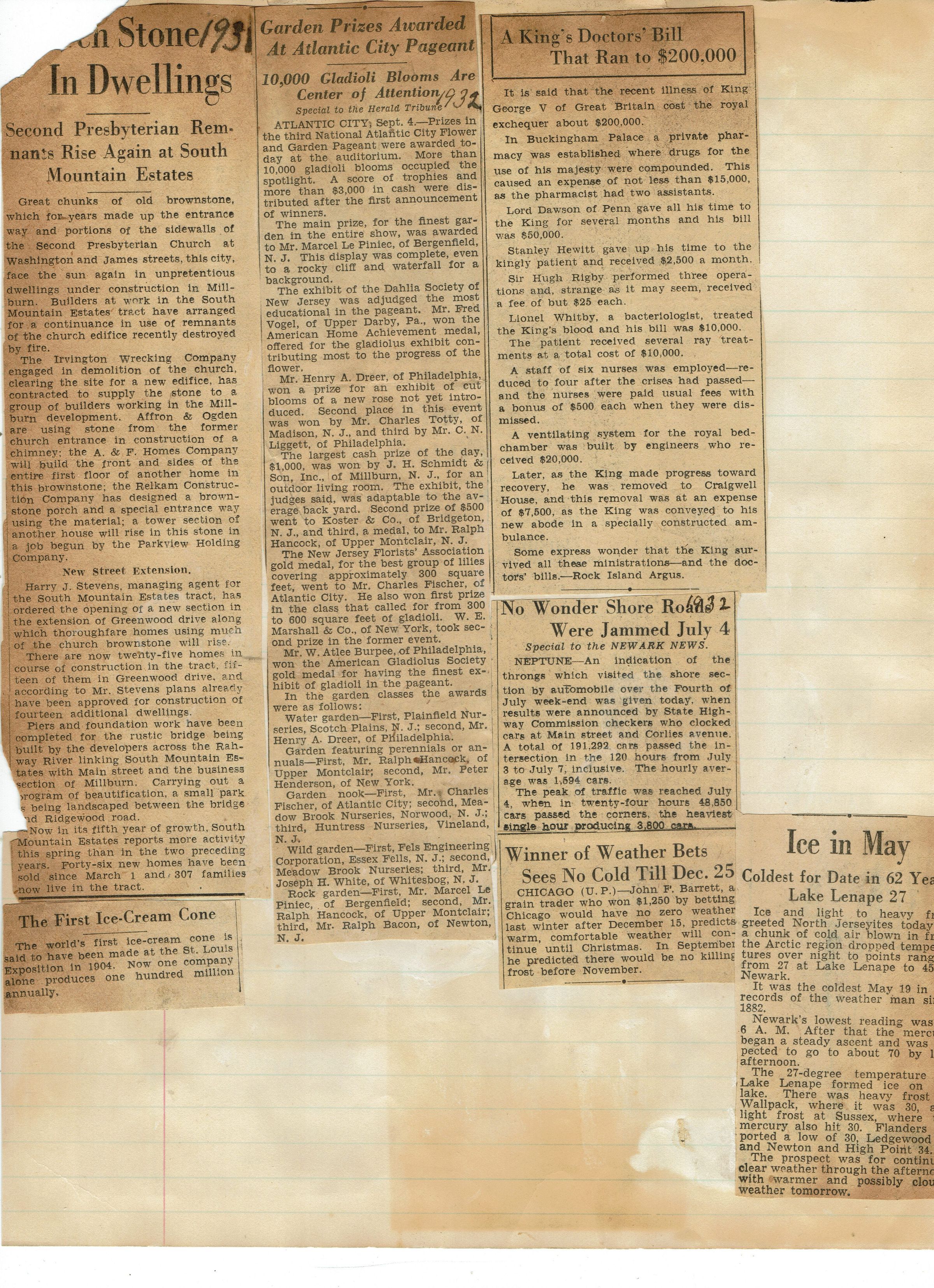 Page from Mrs. Herman Wehrle's scrapbook with announcement of prize awarded to J.H. Schmidt & Son, Inc. of Millburn for exhibit at 1932 Atlantic City Flower Garden Pageant.Acquisition