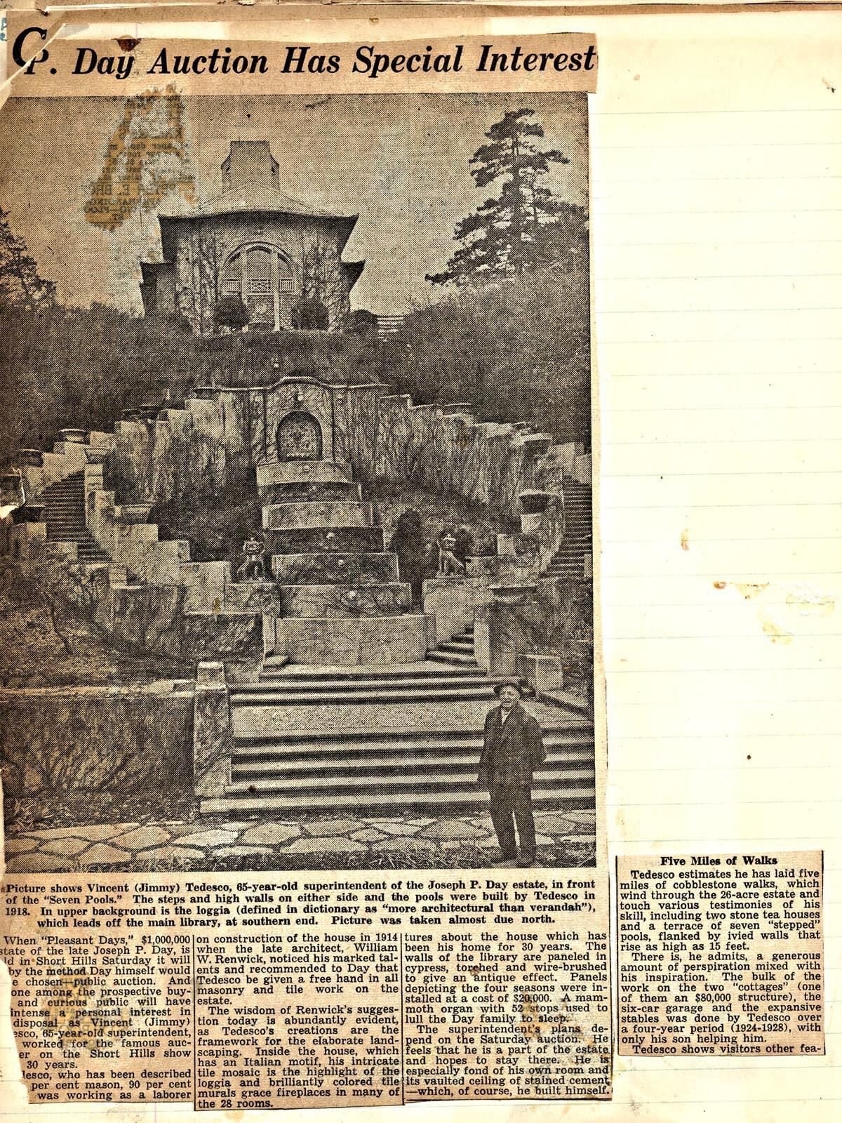 Page from Mrs. Herman C. Wehrle scrapbook containing newspaper clipping about the auction of the Joseph P. Day Estate. Article features descriptions of working on the Day estate and architect William Renwick's designs by superintendent of the estate, Vincent Tedesco.Acquisition