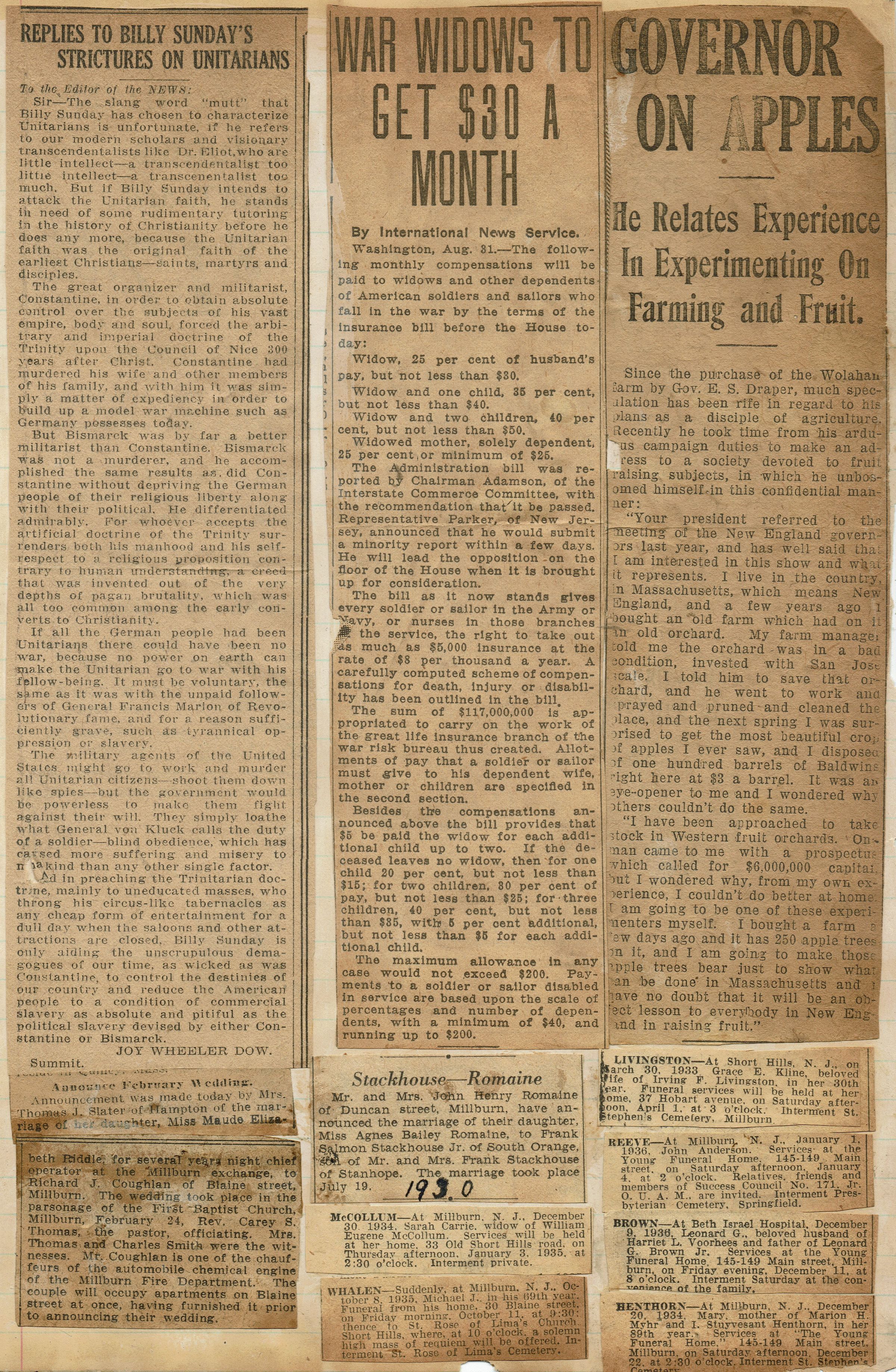 Page from Mrs. Herman Wehrle's scrapbook containing a newspaper clippings about people and events in Millburn. Article by Joy Wheeler Dow about attacks on the Unitarian Church, wedding announcements for Maude Elizabeth Riddle, Agnes Bailey Romaine, daughter of Mr. and Mrs. John Henry Romaine of Duncan Street (1930); Obituaries of: Sarah Carrie McCollum (December 1934), Michael J. Whalen (October 1935), Grace E. Kline Livingston (March 1933), John Anderson Reeve (January 1936), Leonard G. Brown, husband of Harriet L. Voorhees (December 1936), Mary Henthorn (December 1934).Acquisition