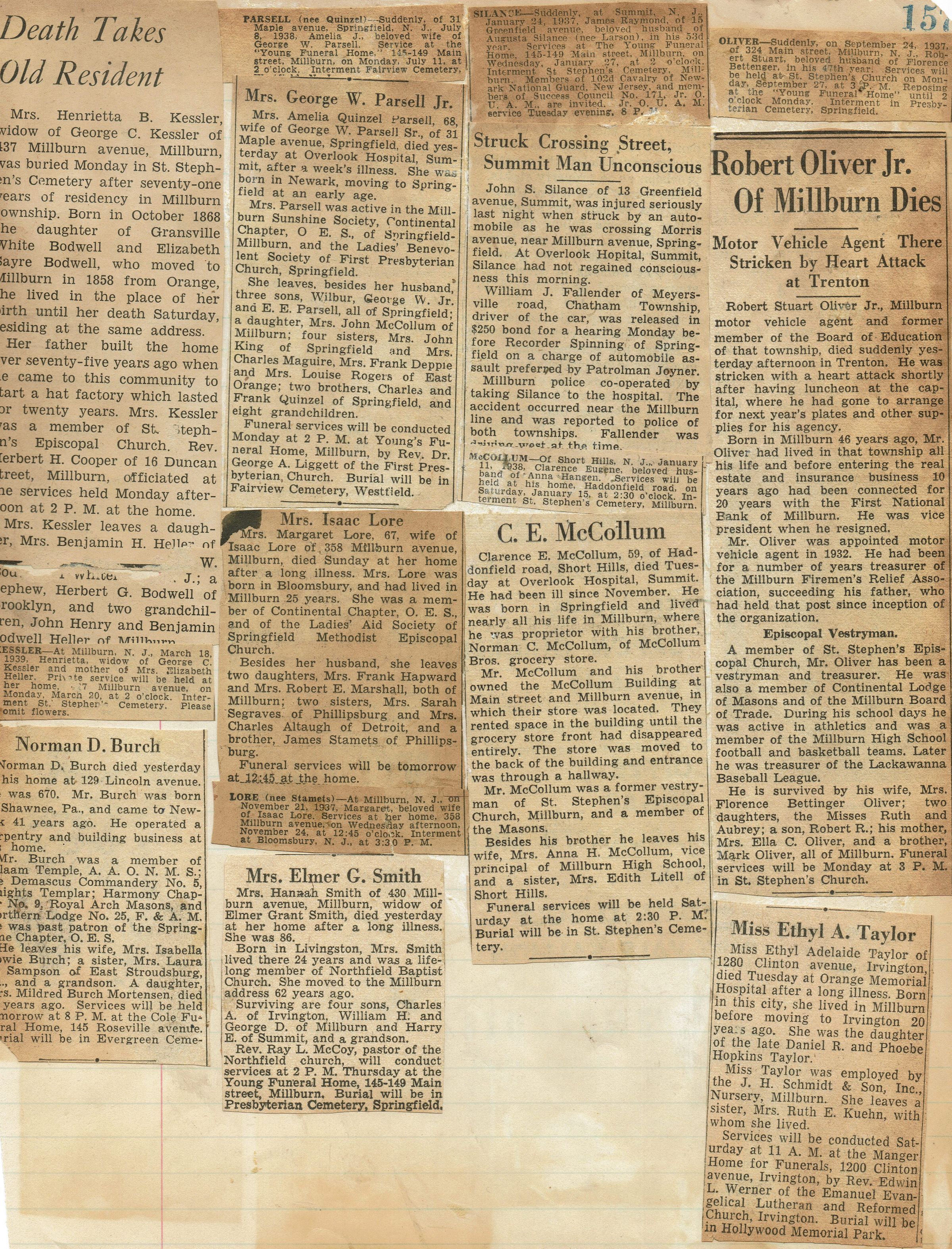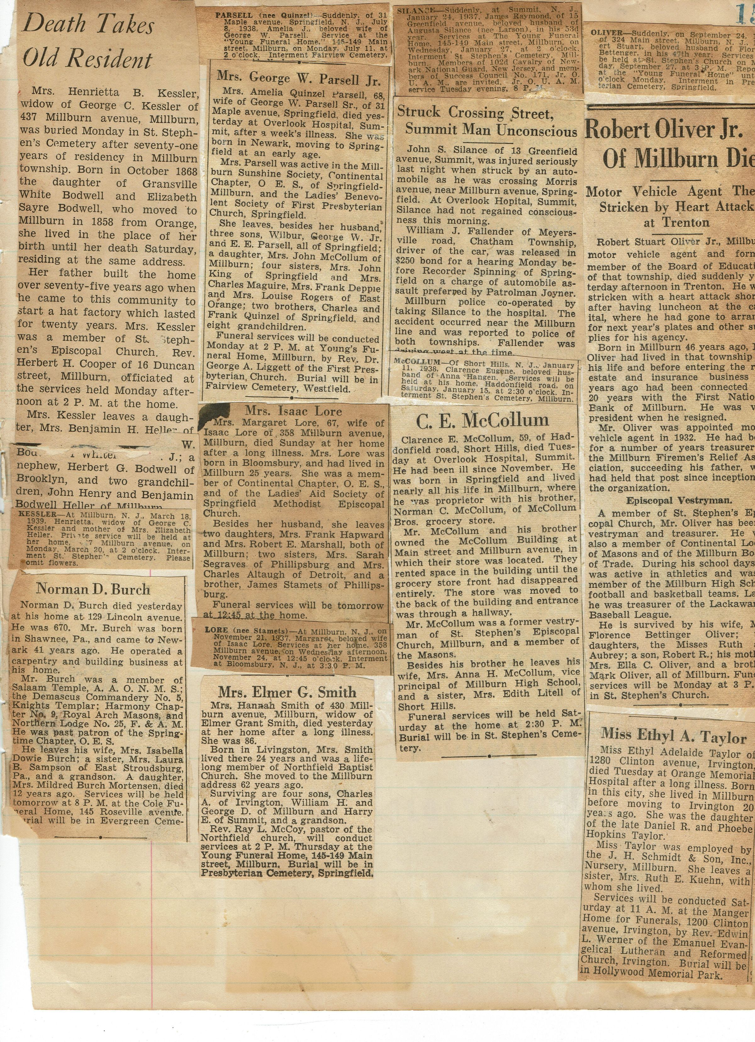 Page from Mrs. Herman Wehrle's scrapbook containing obituaries of prominent people in Millburn, including: Henrietta Kessler (March 1939), Mrs. Amelia Parsell (July 1938), Clarence E. McCollum (January 1938), Ethyl A. Taylor, Robert Oliver, Jr. (September 1937), Mars Isaac Lore (November 1937), Mrs. Elmer G. Smith.Acquisition
