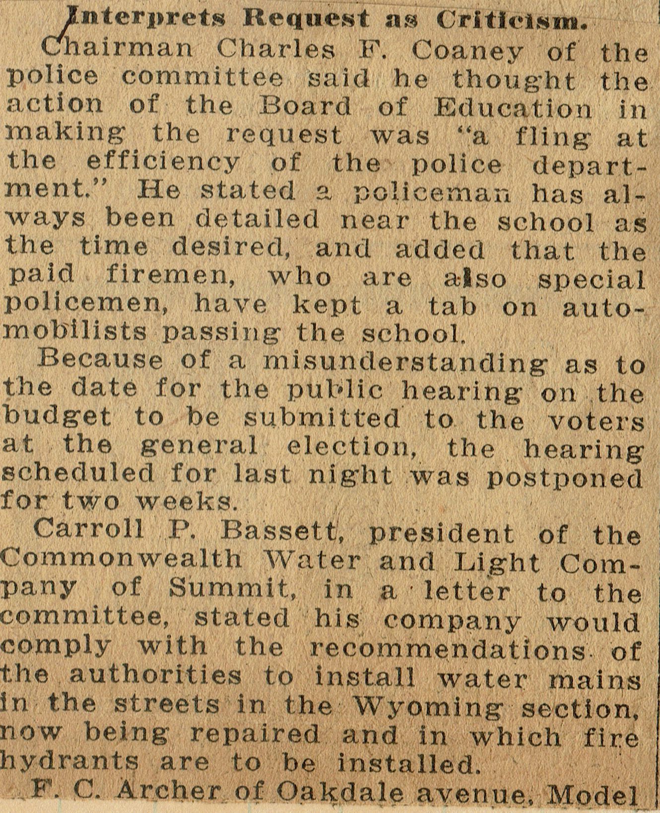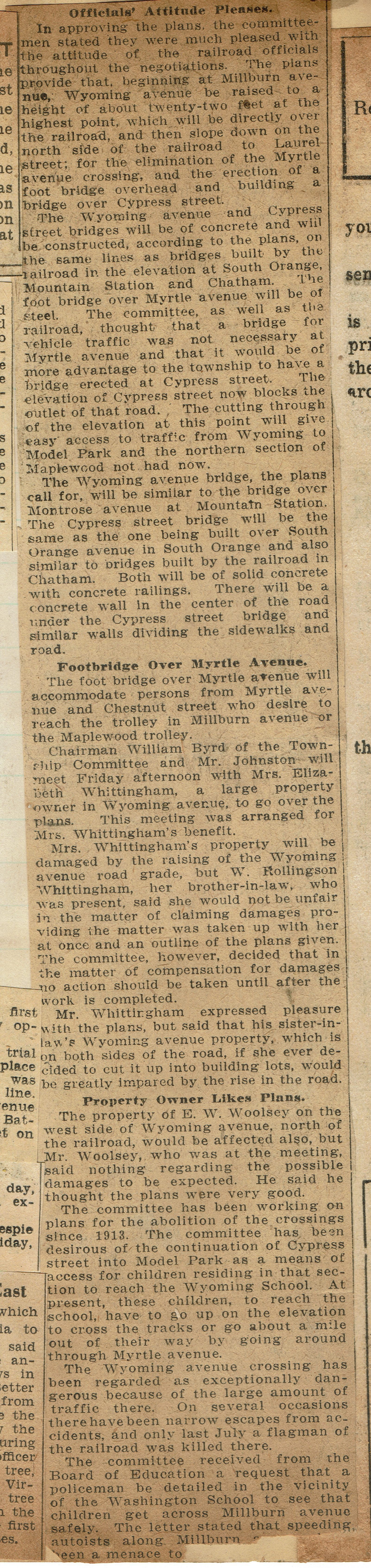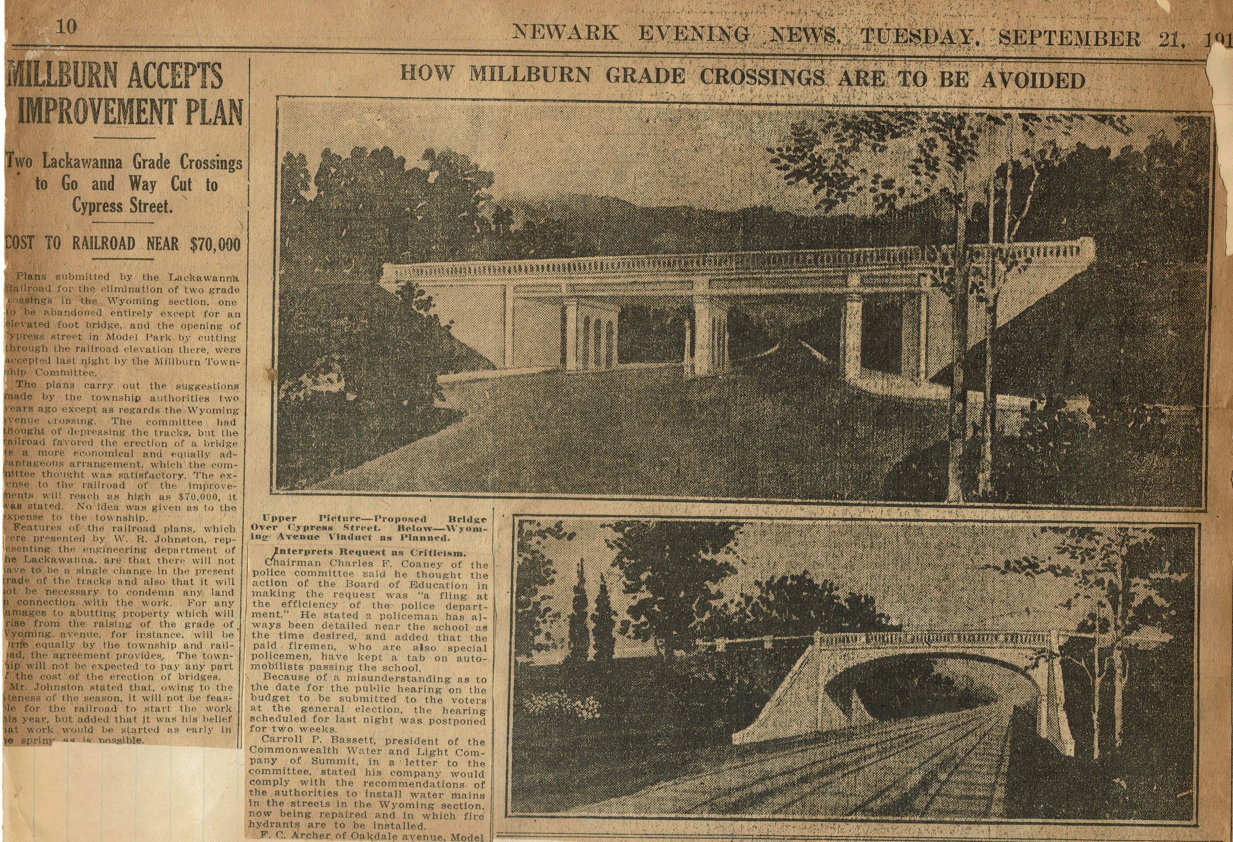 Page from Mrs. Herman Wehrle Scrapbook with clipping from the Newark Evening News, Tuesday, September 21, 1915 describing plans for the elimination of grade crossing in the Wyoming section and the opening of Cypress Street in Model Park (South Mountain). Another clipping (not from the same page of the Newark Evening News) describes other repairs requested in town.Acquisition