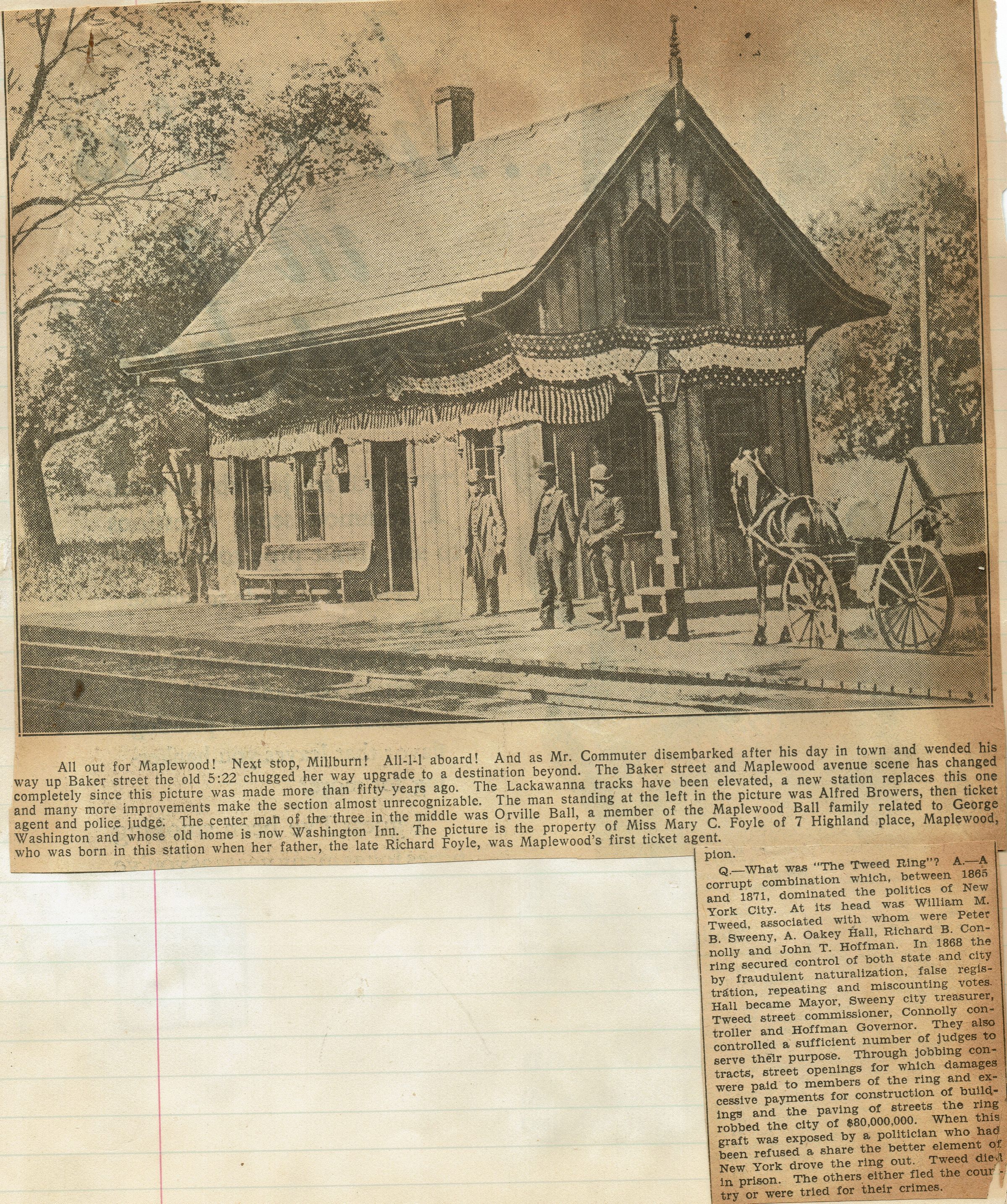 Clipping from Mrs. Herman Wehlre Scrapbook with photograph of first Maplewood train station. According to the caption, " The man standing at the left in the picture was Alfred Browers, then ticket agent and police judge. The Center man of the three in the middle was Orville Ball, a member of the Maplewood Ball family related to George Washington and whose old home is now Washington Inn. The picture is in the property of Miss Mary C. Foyle of 7 Highland place, Maplewood, who was born in this station when her father, the late Richard Foyle, was Maplewood's first ticket agent."Acquisition