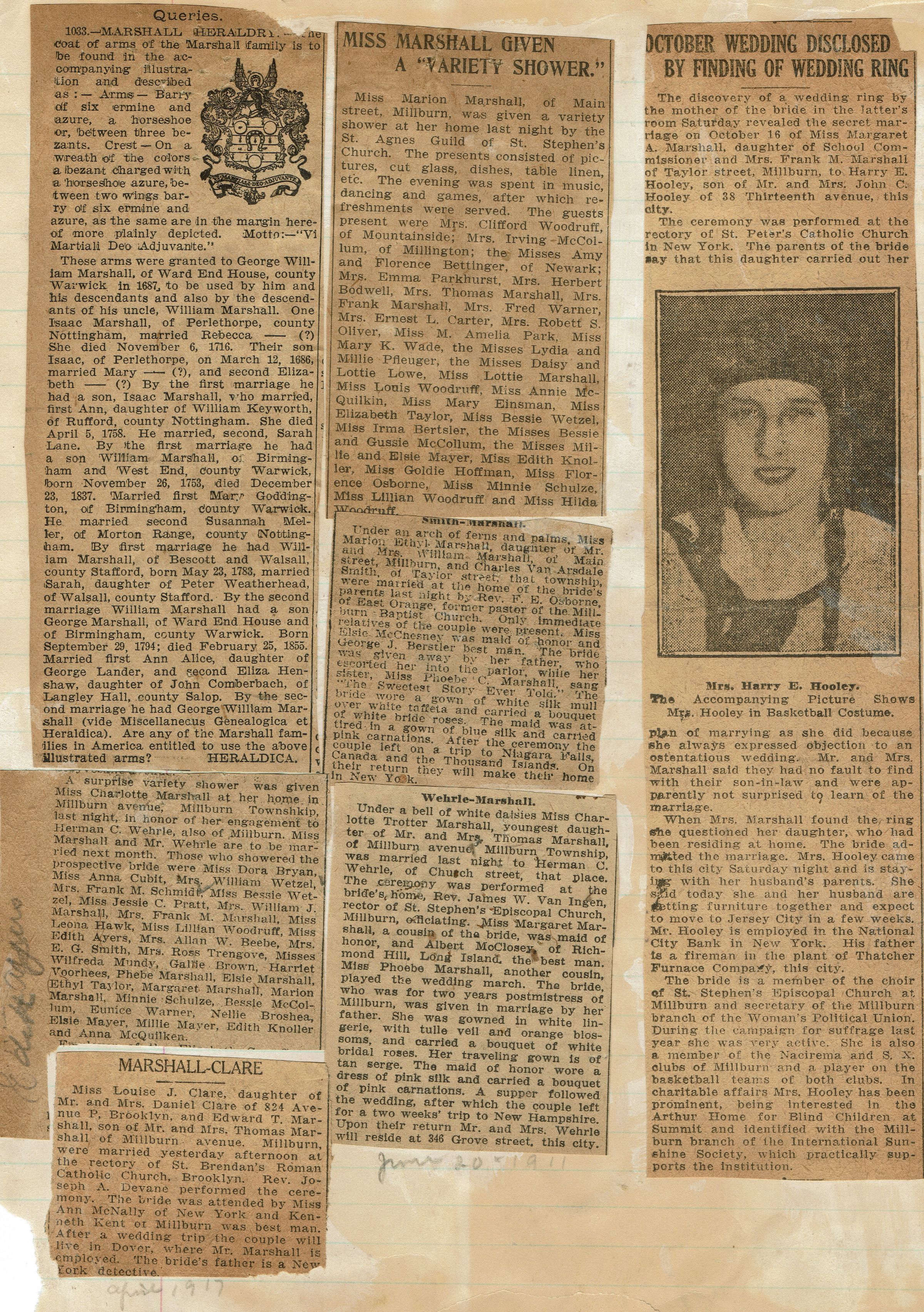 Page from Mrs. Herman Wehrle's Scrapbook containing newspaper clippings relating to the Marshall family. Margaret Marshall, daughter of Frank M. Marshall married Harry E. Hooley, Charlotte Trotter Marshall, daughter of Mr. and Mrs. Thomas Marshall married Herman C. Wehrle (June 20, 1911), Marion Ethyl Marshall, daughter of Mr. and Mrs. William Marshall, married Chales Van Arsdale, Louise J. Clare married Edward T. Marshall (April 1917), shower for Charlotte Marshall in honor of her upcoming wedding to Herman Wehrle, Marion Marshall was given a "variety shower." There is also a clipping about the Marshall coat of arms and family history.Acquisition