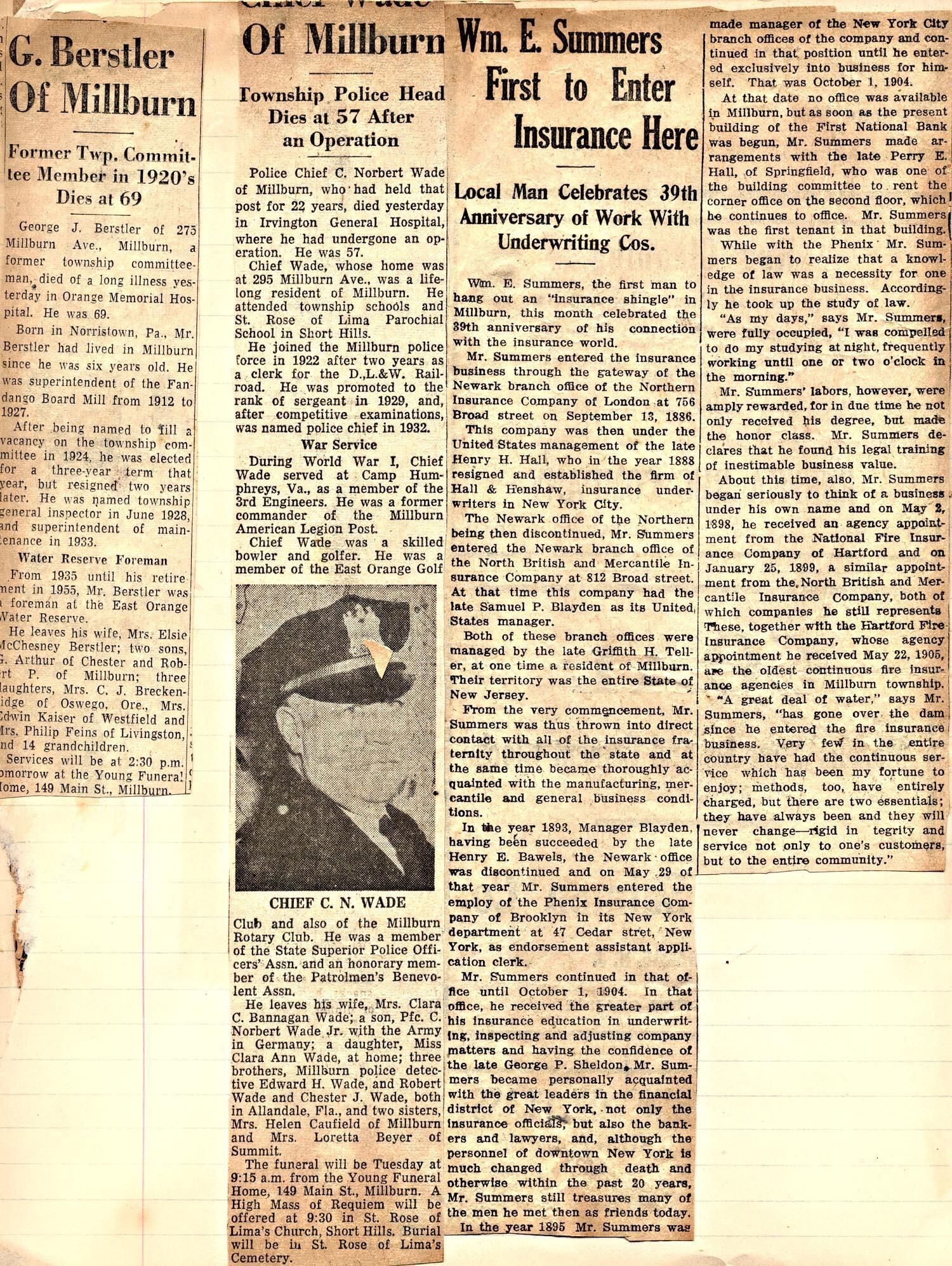 Clippings from H.C. Wehrle scrapbook: Police Chief Norbert Wade Obituary, William E. Summers 39th Anniversary in Insurance in Millburn, George J. Berstler obituary.Acquisition