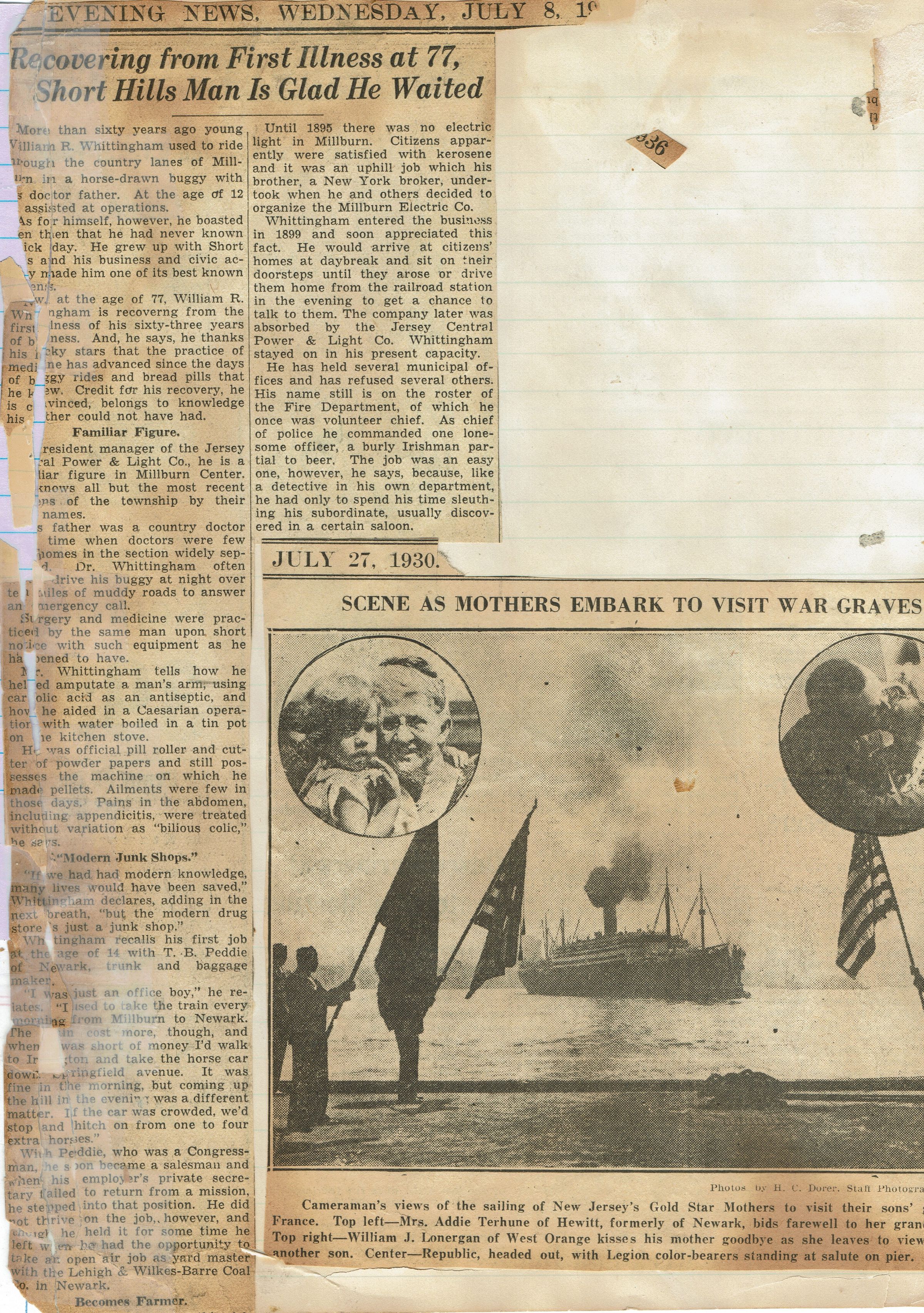Page from Mrs. Herman Wehrle's scrapbook containing a newspaper clipping about William R. Whittingham from the Newark Evening News, July 8, 1936.Acquisition